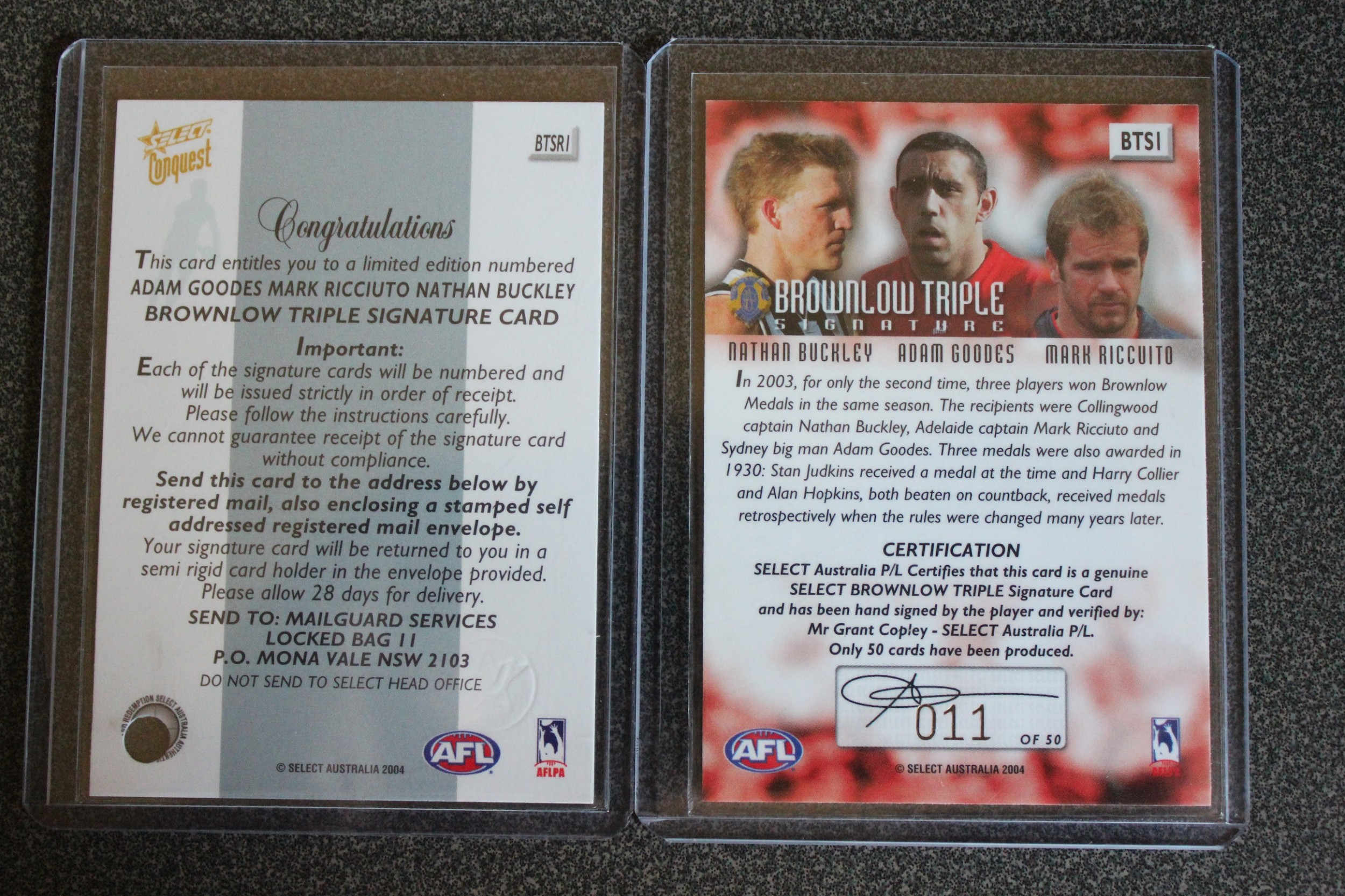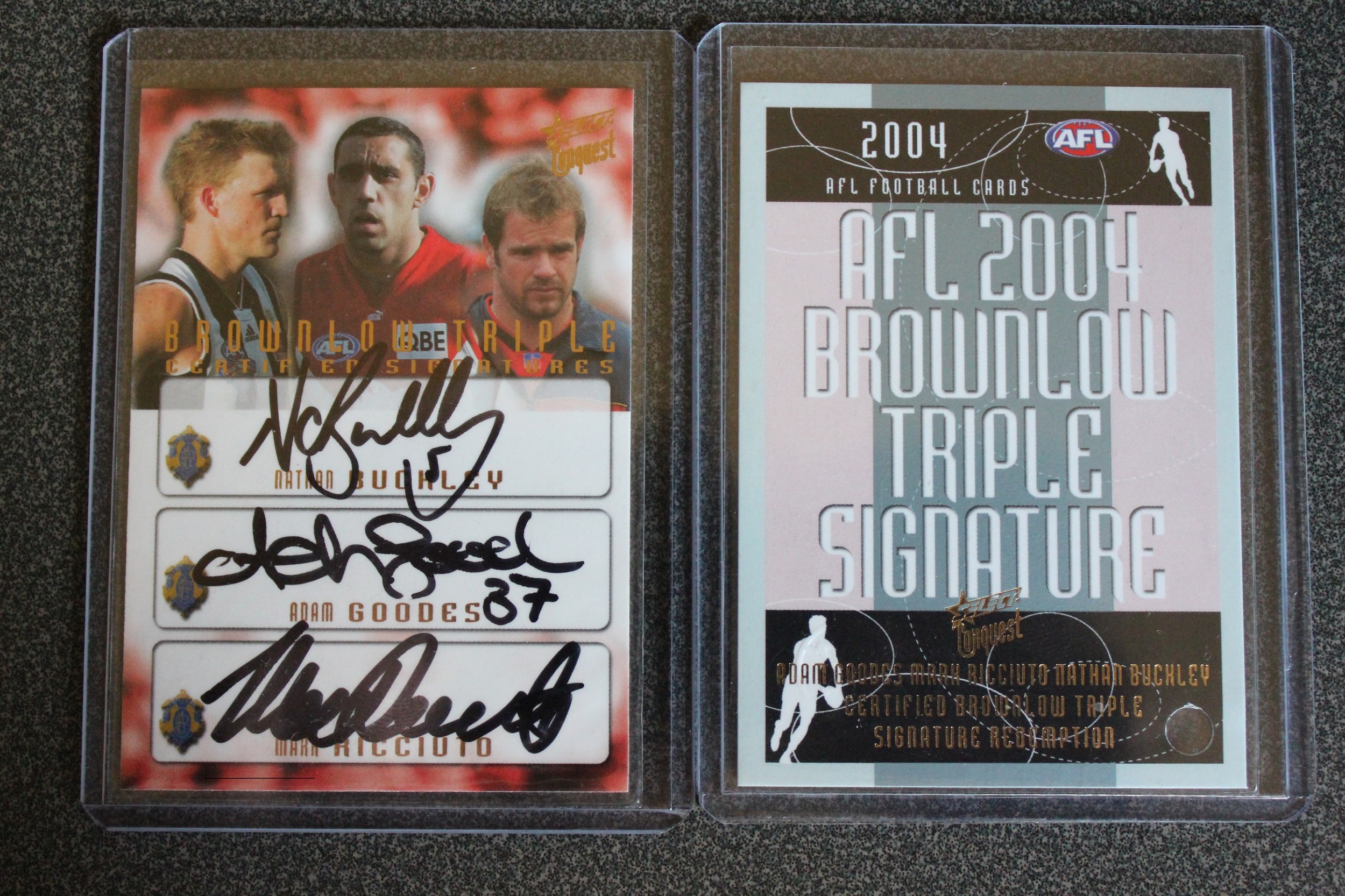 for sale is a 2004 triple brownlow signature of adam goodes ,nathan buckley and mark riccuito