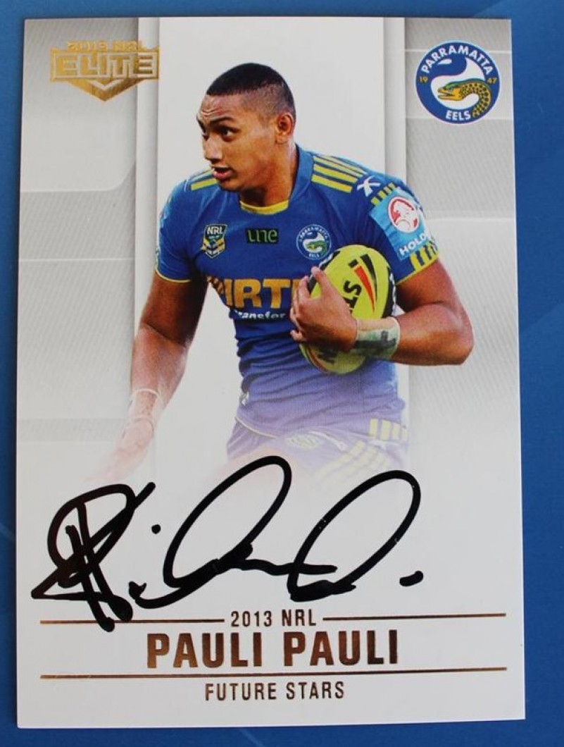 This card is for 2013 ESP Elite Future Stars FS9 Pauli Pauli #1/105 Parramatta Eels. This card was hand signed by the player on the card.This is a rare opportunity to own a card serial numbered 001