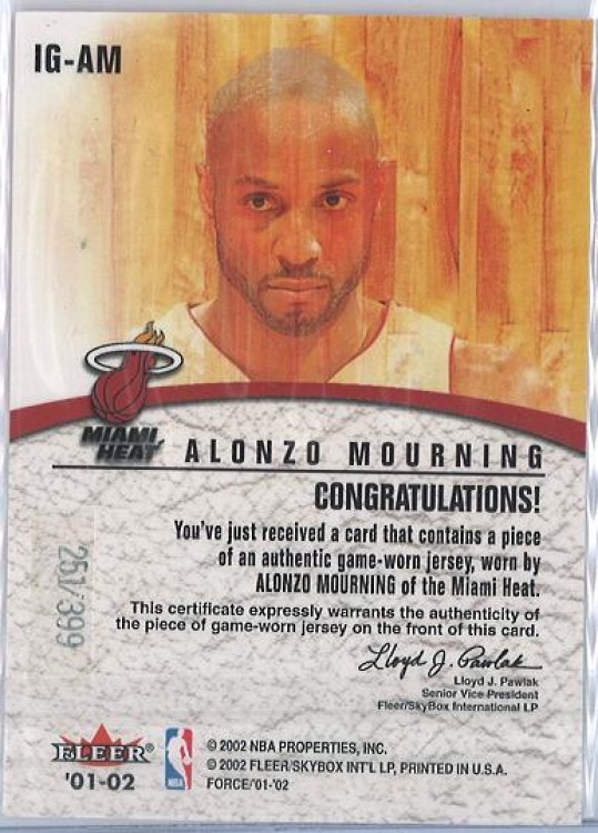 2001/02 FLEER FOCUS ALONZO MOURNING JERSEY INSIDE THE GAME 251/399