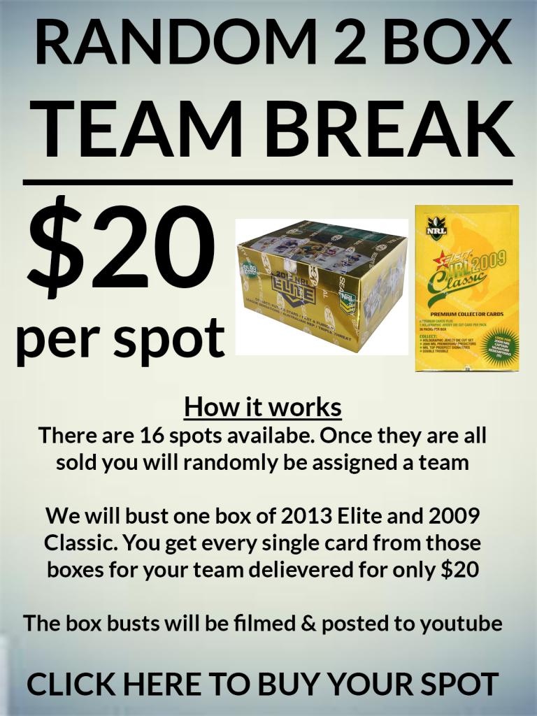 There are 16 spots in thes break (1 for each NRL team). Once all the spots are sold and paid for they will be randomised through random.org to see who gets which team.
