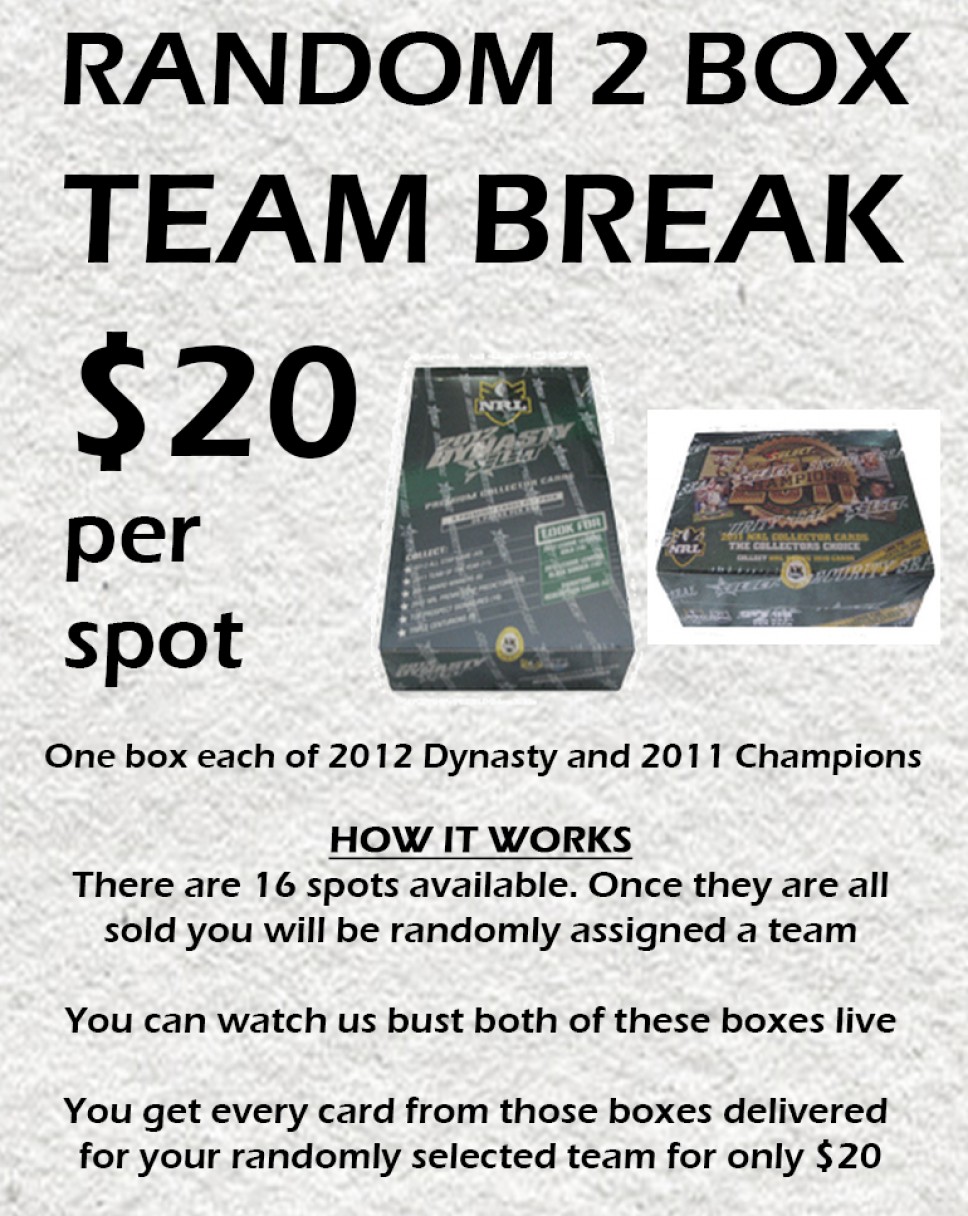 There are 16 spots in thes break (1 for each NRL team). Once all the spots are sold and paid for they will be randomised through random.org to see who gets which team.