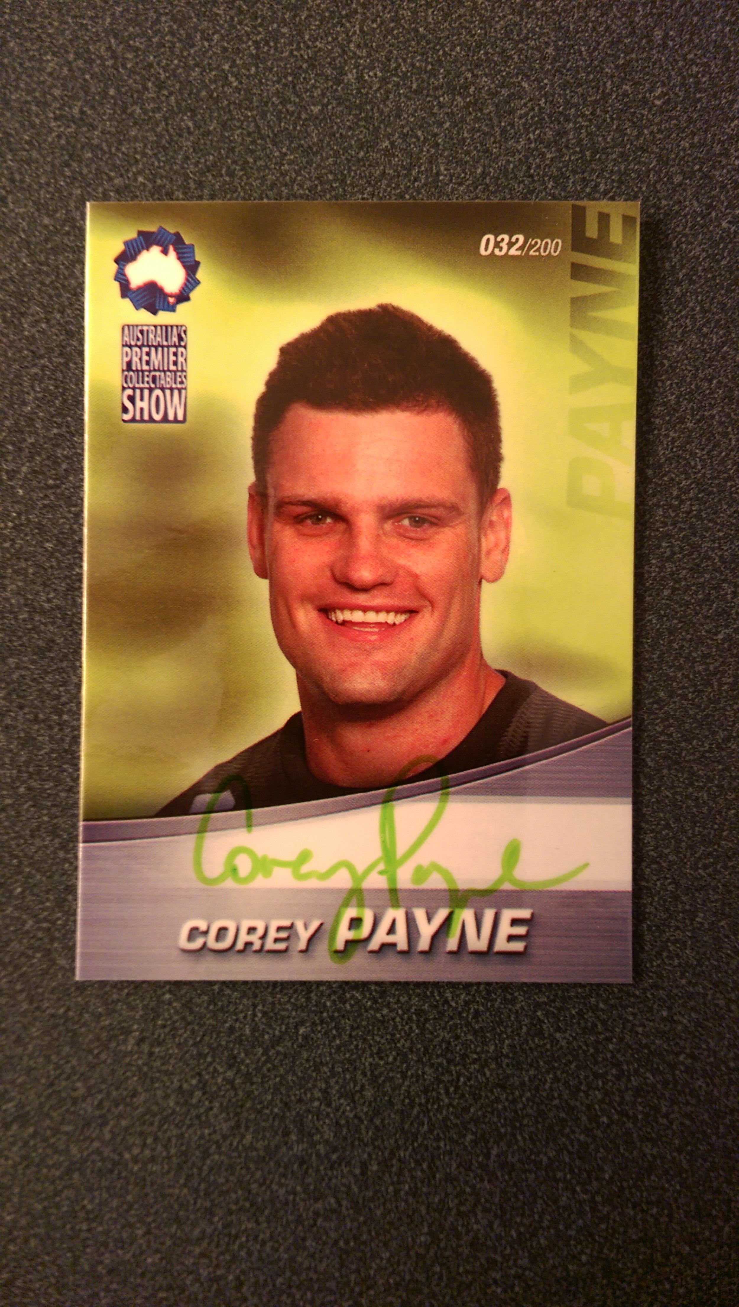 APSC Corey Payne signature card, number 32 of 200 signed in green marker, issued 18 April 2010 and in excellent condition.