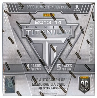 2013-14 Panini Titanium Hockey Hobby Box Each Box contains Five Memorabilia Cards or Autographs! At least One Autograph Per Box!One Memorabilia or Autograph card per hobby pack, including Game Gear, Four Star Memorabilia, Six Star Memorabilia, Milestone Goal Die-Cuts and Metallic Marks Autograph cards!The most limited rookie cards on the market are only available in Titanium, with each card serial numbered to the rookie's jersey number.Look for new Hobby Exclusive parallels, featuring veteran card s serial numbered to the player's jersey number and draft position.Look for Social Signatures, featuring autographs and inscriptions of their social media handles. Find Dual and Triple Autograph cards of the newest NHL Dual Rookie class.Key Rookies: Nail Yakupov, Alex Galchenyuk, Jonathan Huberdeau, Brendan Gallagher, Mikael Granlund, Vladimir Tarasenko, Justin Schultz, Mikhail Grigorenko, Charlie Coyle, Cory Conacher, Damien Brunner, Viktor Fasth, Ryan Murphy, Thomas Hickey, Jack Campbell.
