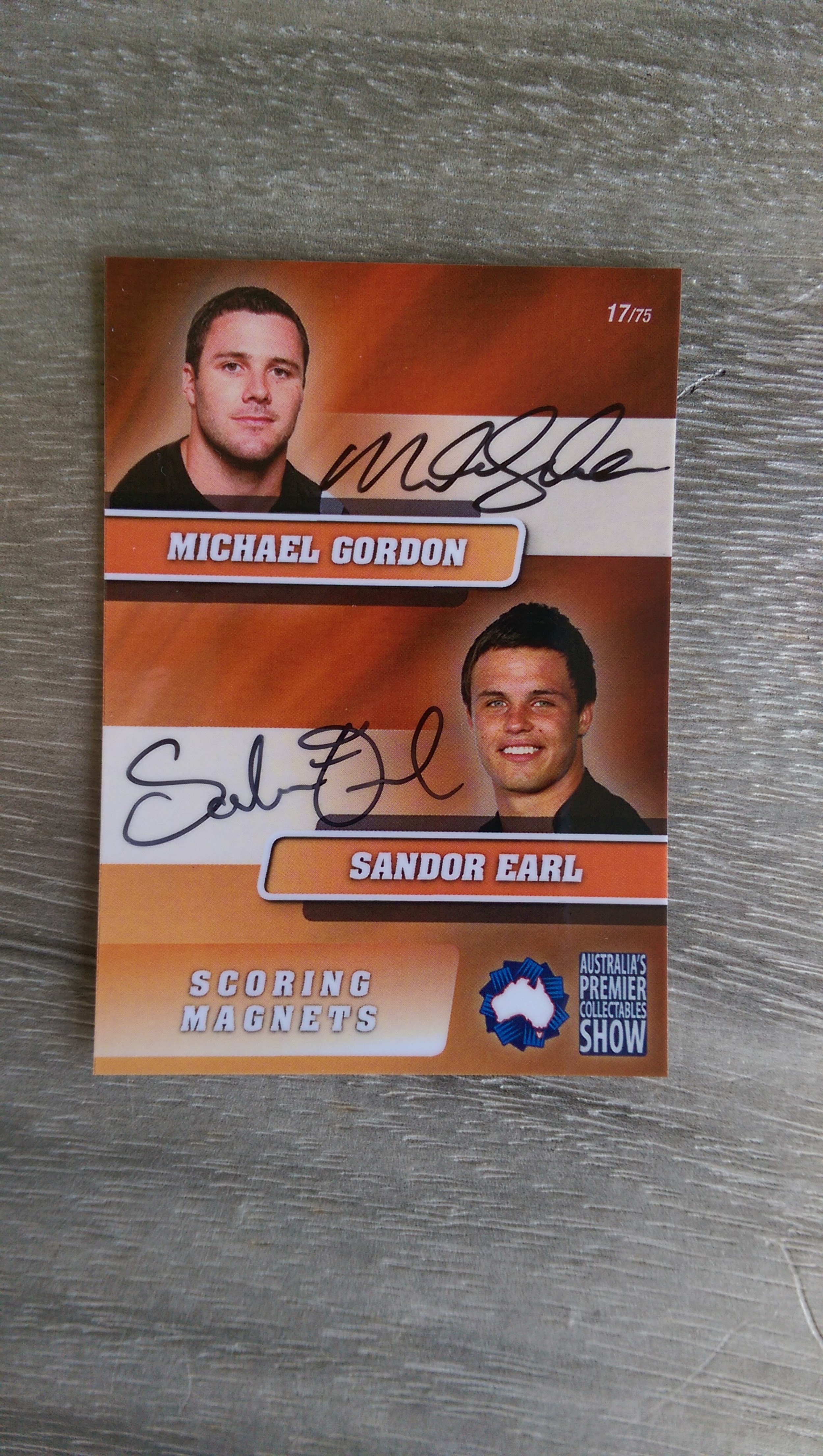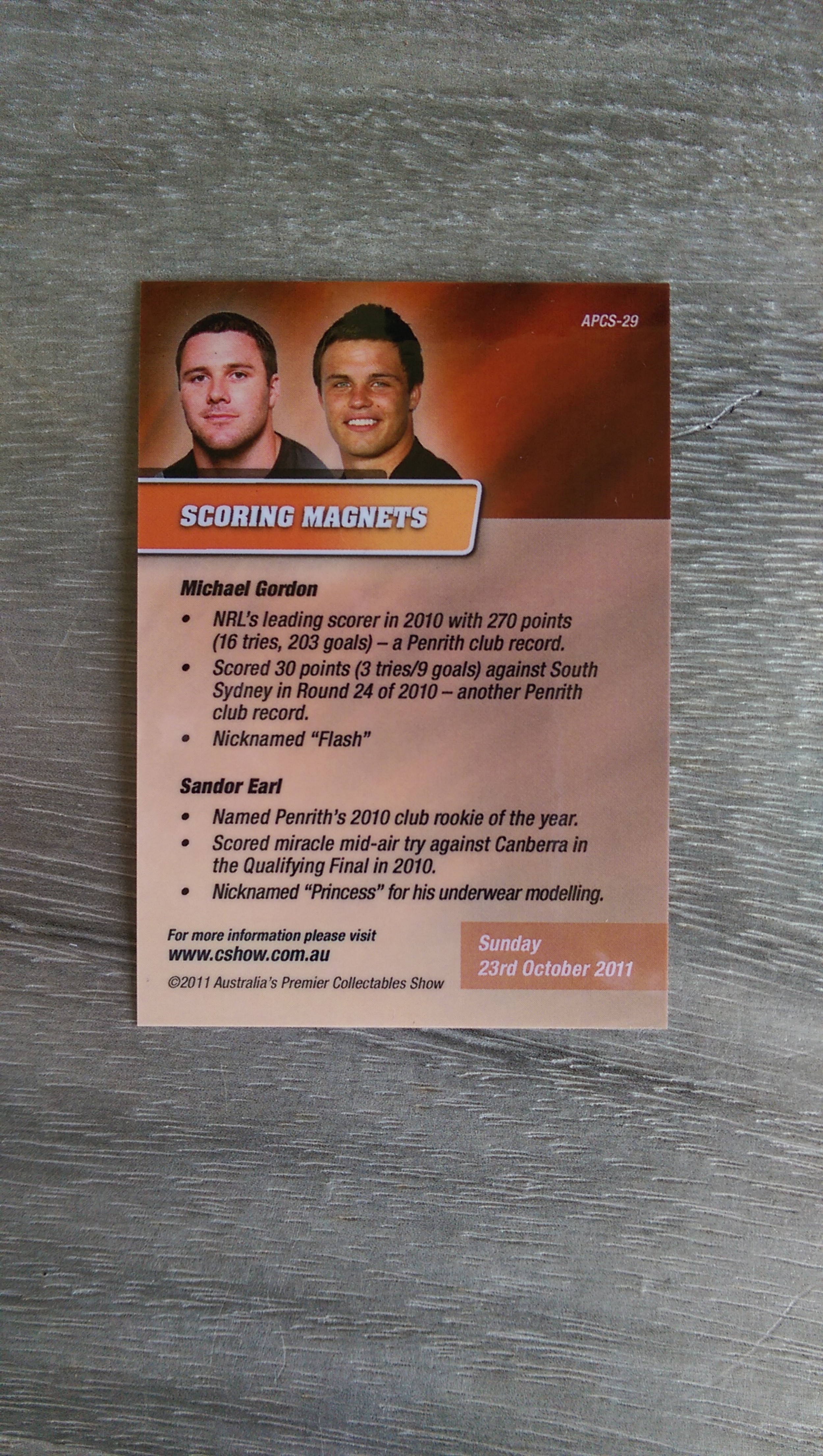 Here is a Scoring Magnets Michael Gordon & Sandor Earl signed card (Number 17 of 75) issued at the APCS fair on 23 October 2011 at Penrith.