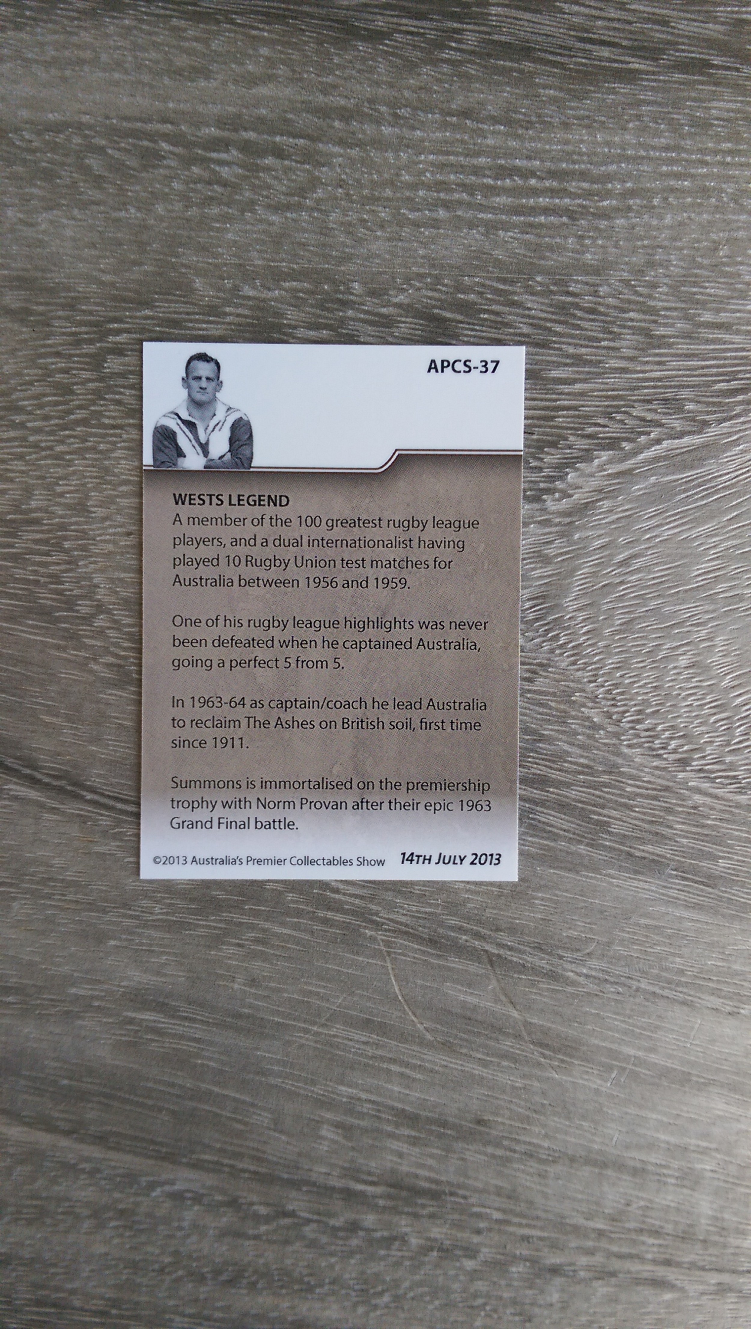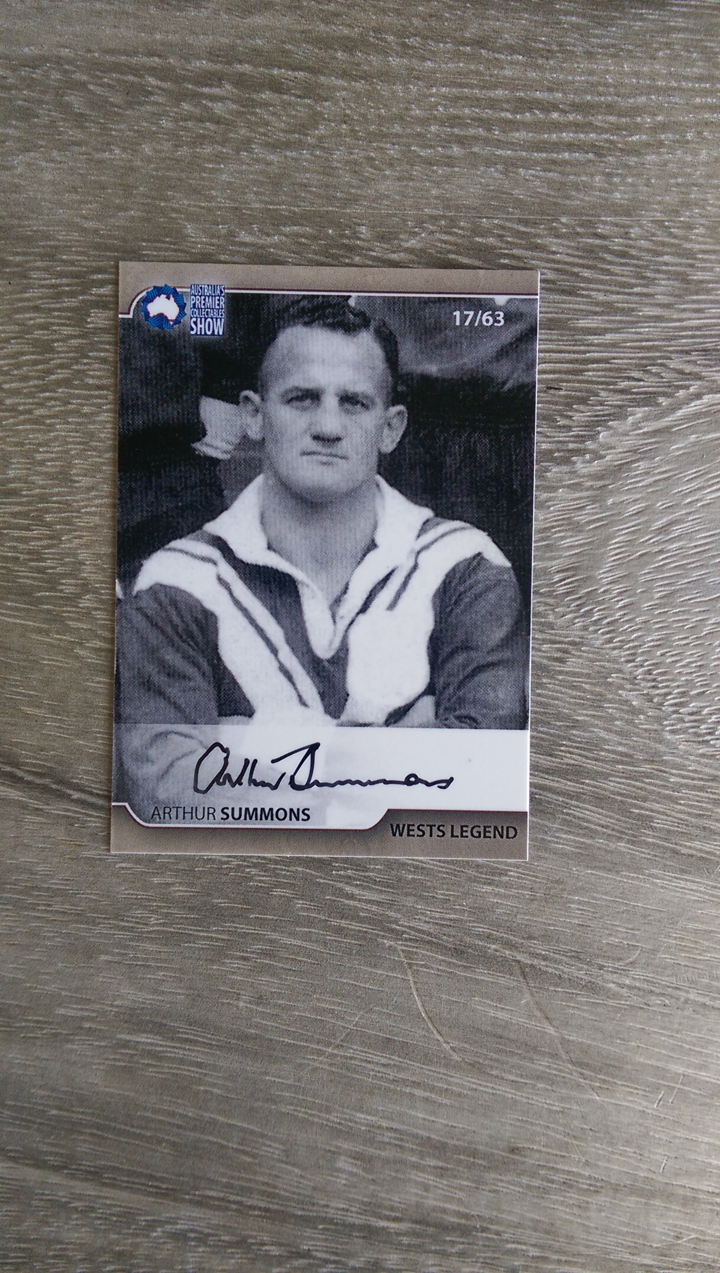Here is a Wests Legend Arthur Summons signed card (Number 17 of 63) issued at the APCS fair on 23 October 2013 at Penrith.