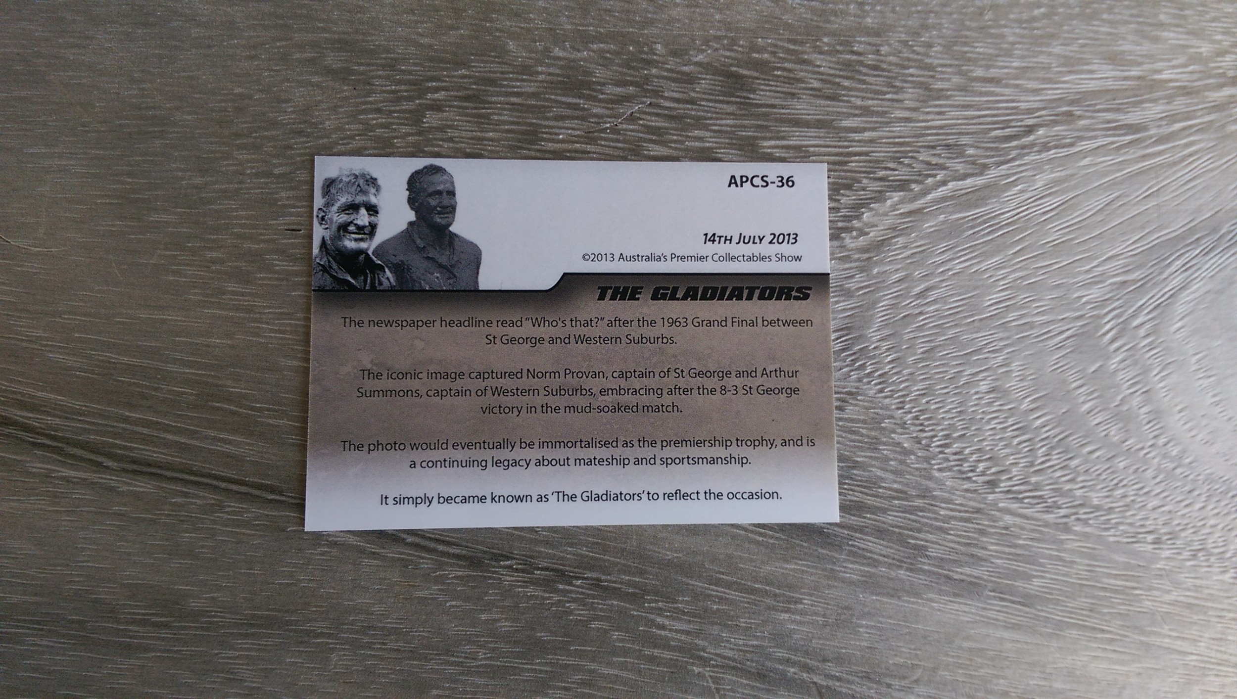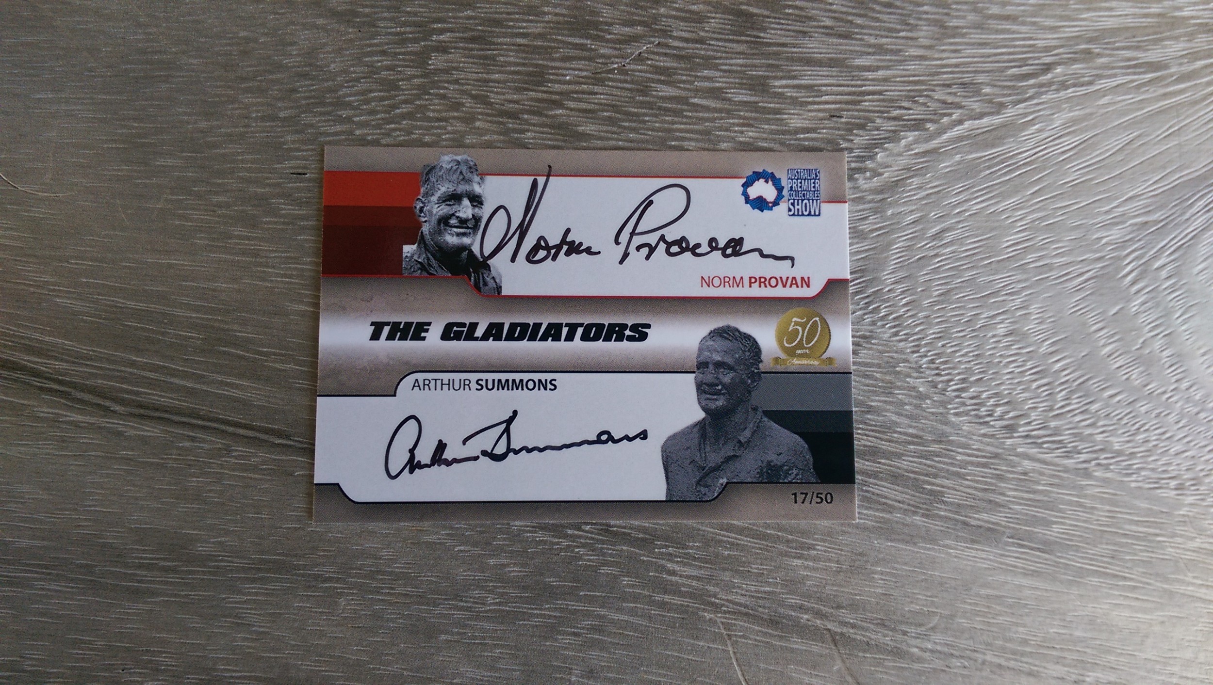 Here is a The Gladiatiors Arthur Summons & Norm Provan signed card (Number 17 of 50) issued at the APCS fair on 23 October 2013 at Penrith.