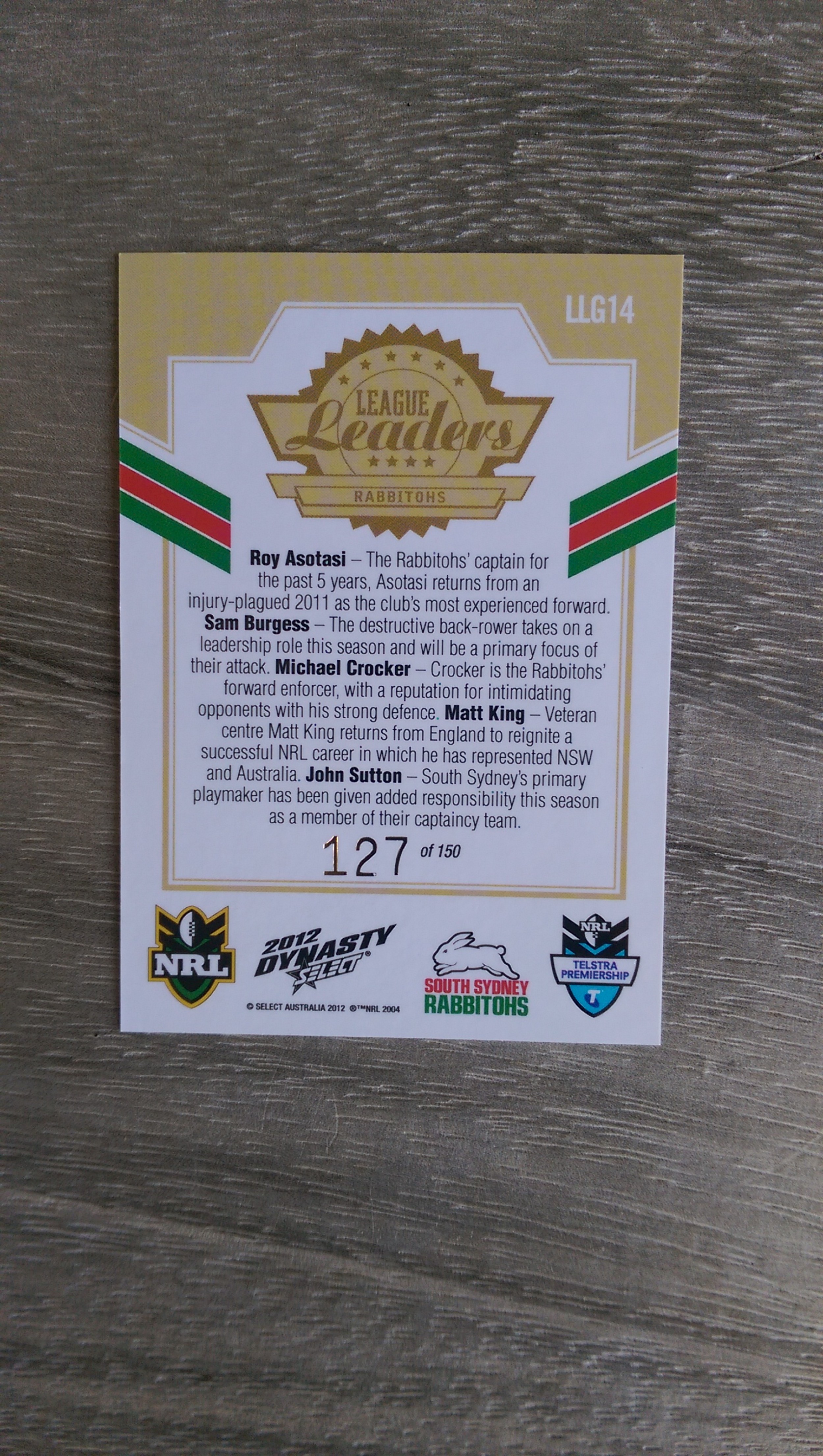 Here is a 2012 NRL Dynasty South Sydney Rabbitohs Gold League Leaders card, number 127 of 150.