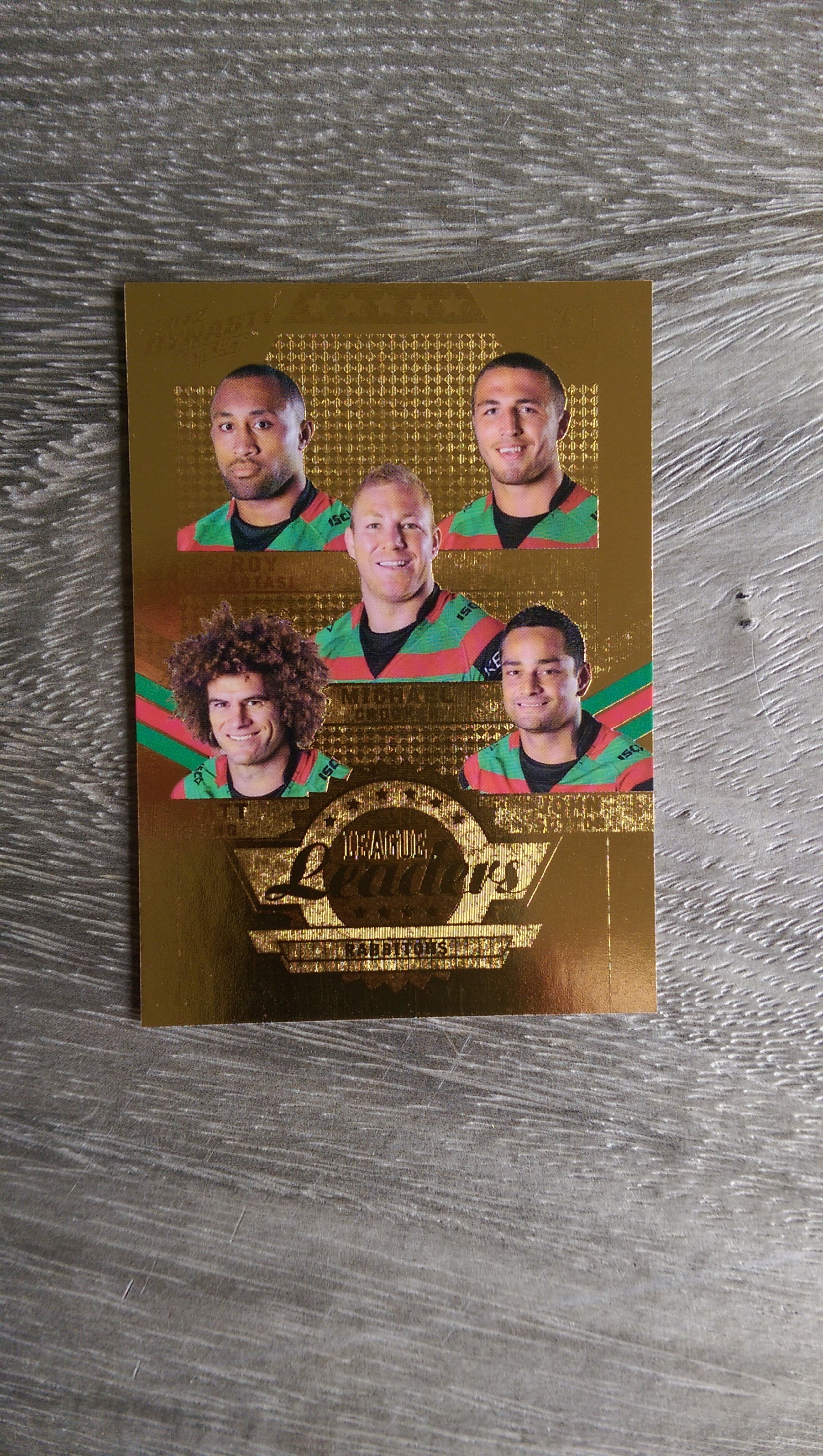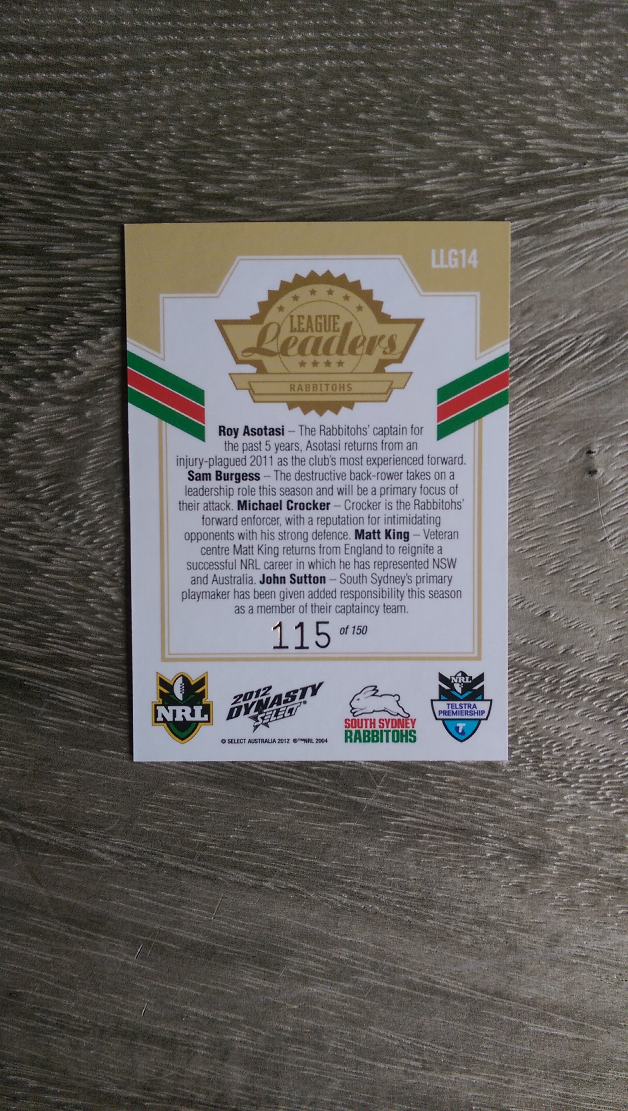 Here is a 2012 NRL Dynasty South Sydney Rabbitohs Gold League Leaders card, number 115 of 150.