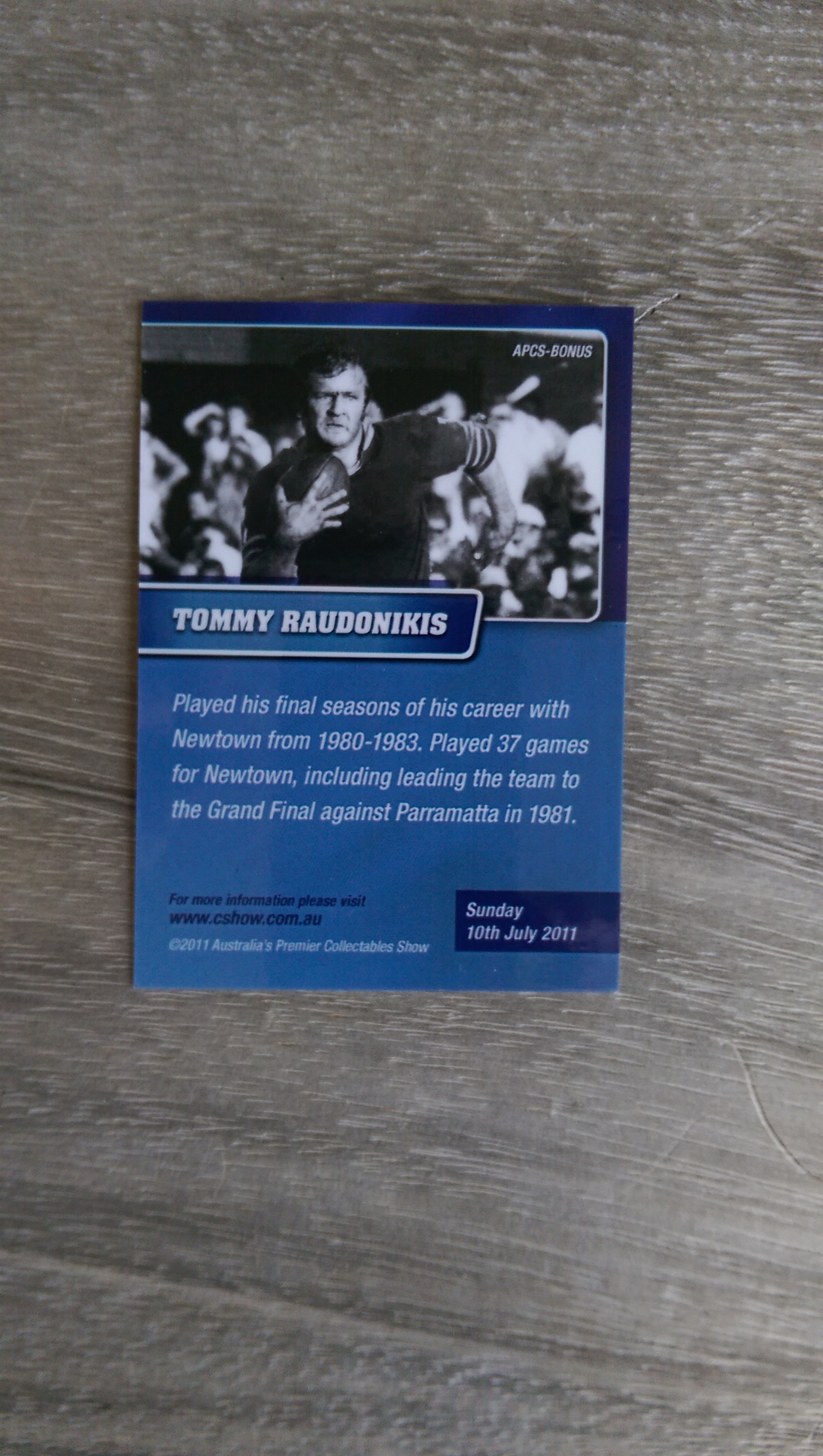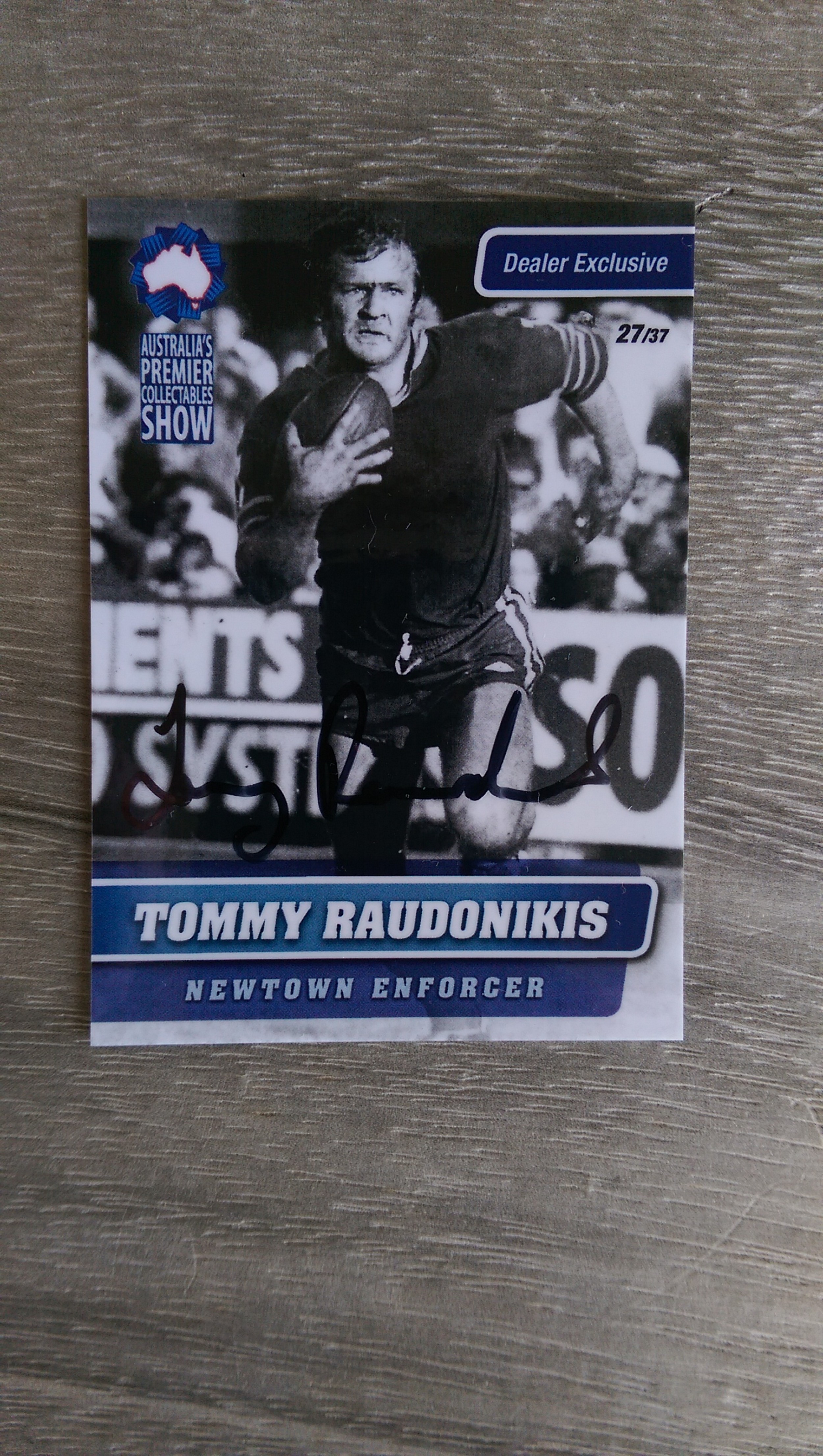 Here is a Dealer Exclusive Newtown Enforcer Tommy Raudonikis signed card (Number 27 of 37) issued at the APCS fair on 10 July 2011 at Leichhardt Town Hall.