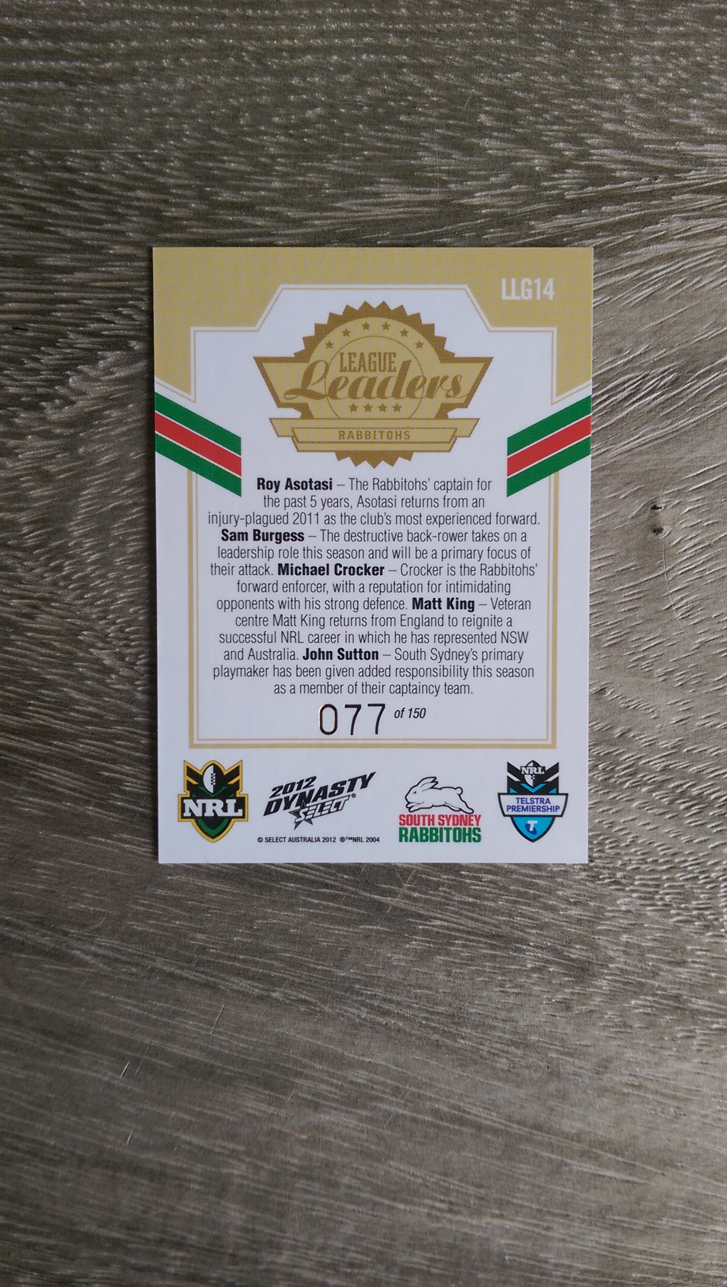 Here is a 2012 NRL Dynasty South Sydney Rabbitohs Gold League Leaders card, number 77 of 150.
