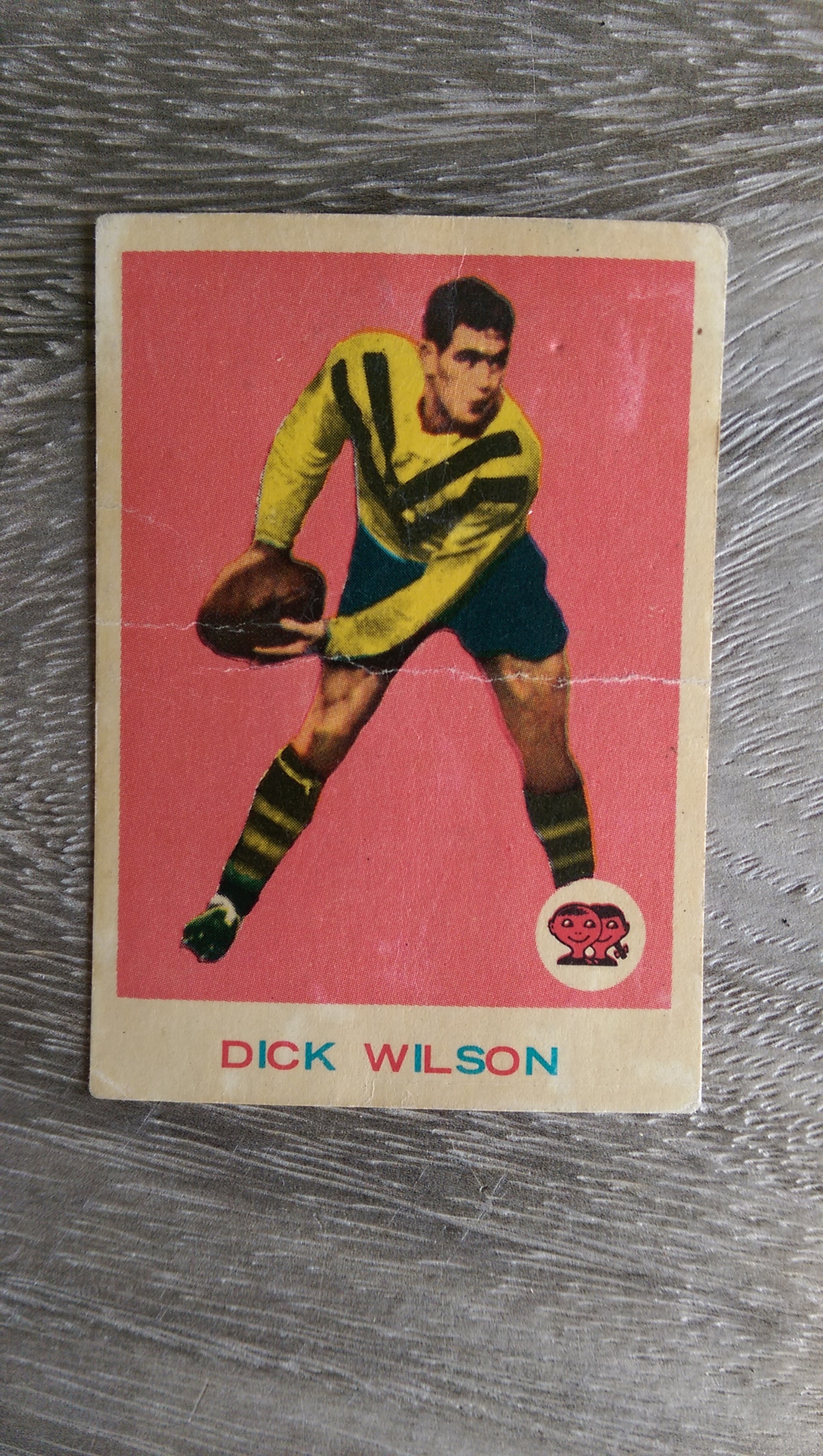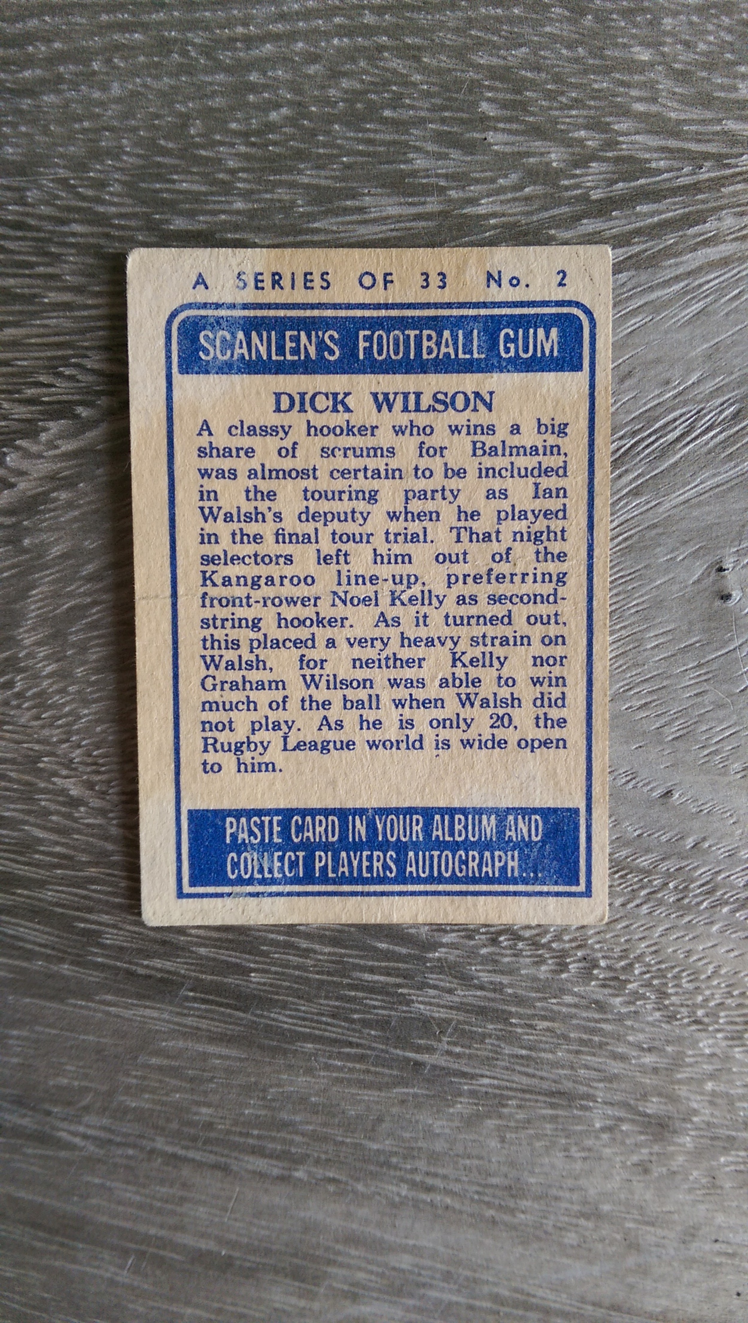 Here is a Dick Wilson card (No 2 of 33) from Scanlens rugby league series issued in 1964 and it is in fair condition.