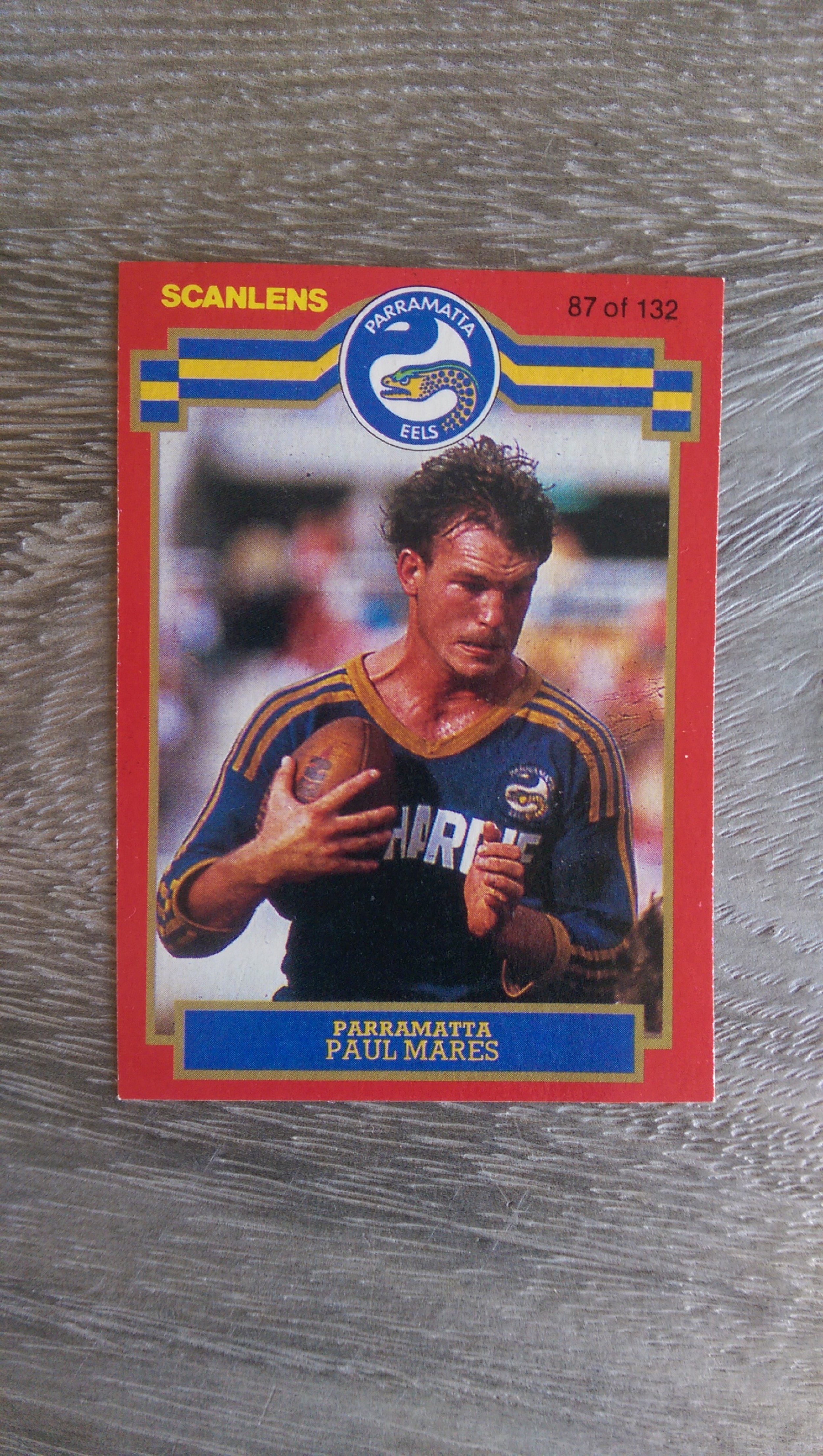 Here is a Paul Mares card (No 87 of 132) from Scanlens rugby league series issued in 1986 and it is in very good/excellent condition.