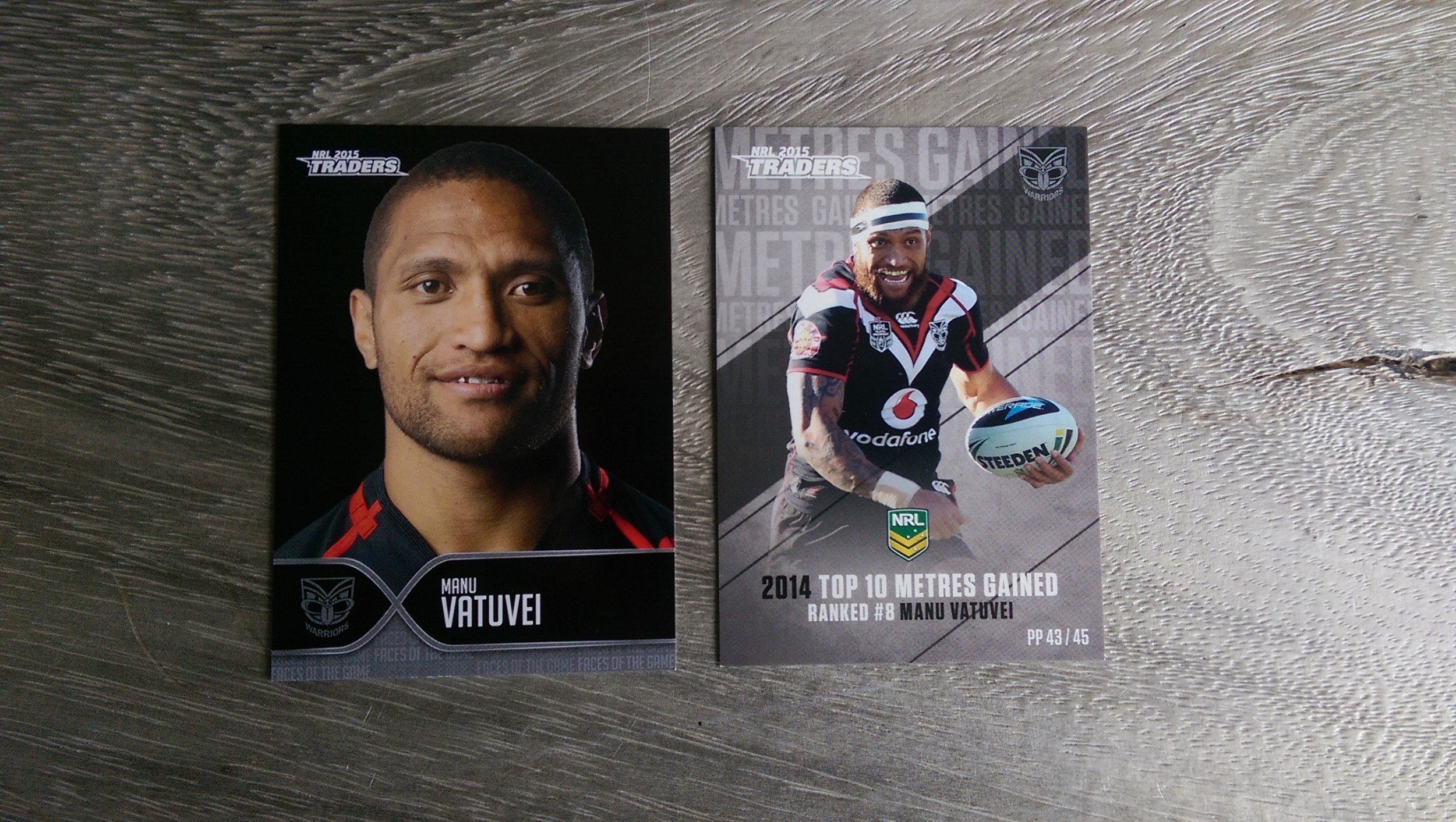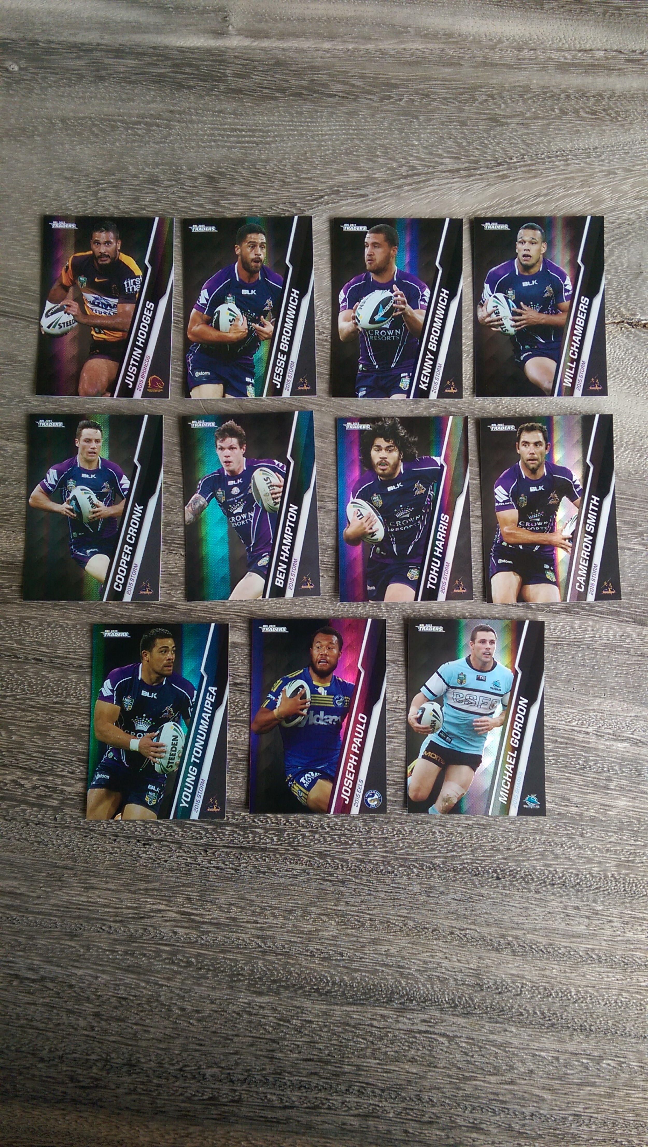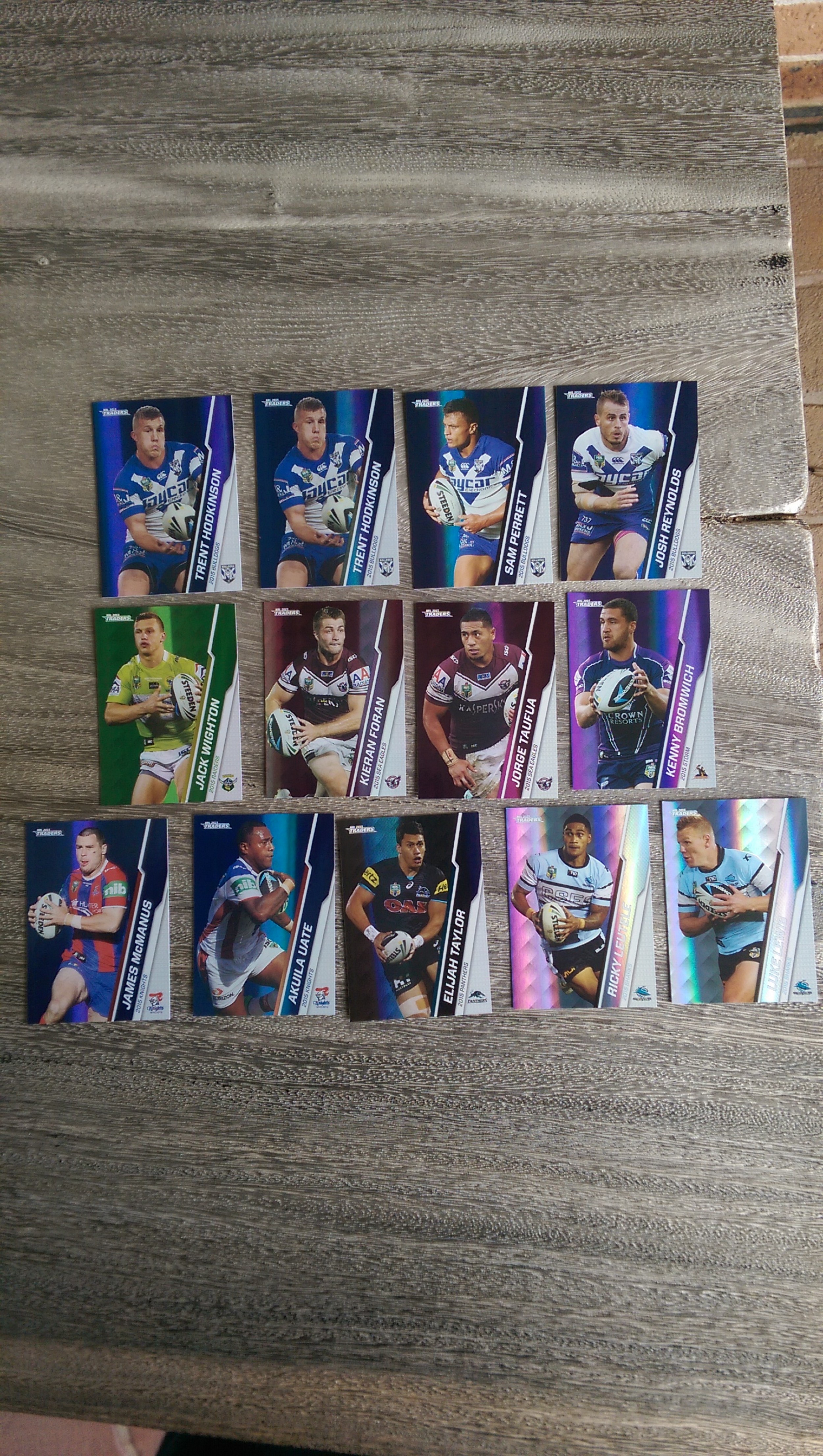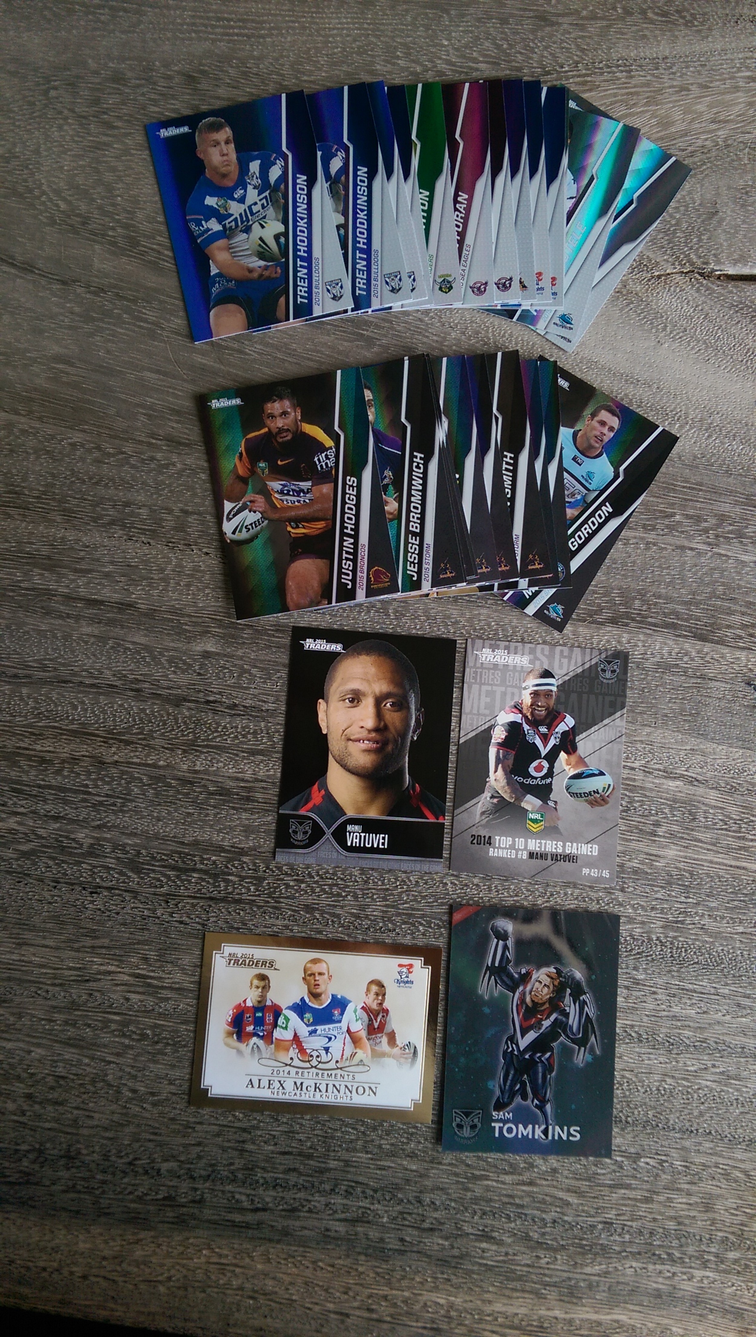 Here are 28 insert cards from ESP's 2015 NRL Traders series and they are in excellent condition. Cards included are Parallel cards x 13 (No's P11 x 2, P14, P16, P27, P49, P54, P56, P67, P72, P89 & P97), Special Parallels x 11 (No's PS3, PS55, PS56, PS57, PS58, PS59, PS60, PS62, PS63, PS78 & PS94), Faces of the Game x 1 FOTG45), Pictures of the Puzzle x 1 (PP43), Retirements x 1 (R8) and Galactic Heroes x 1 (GH17).