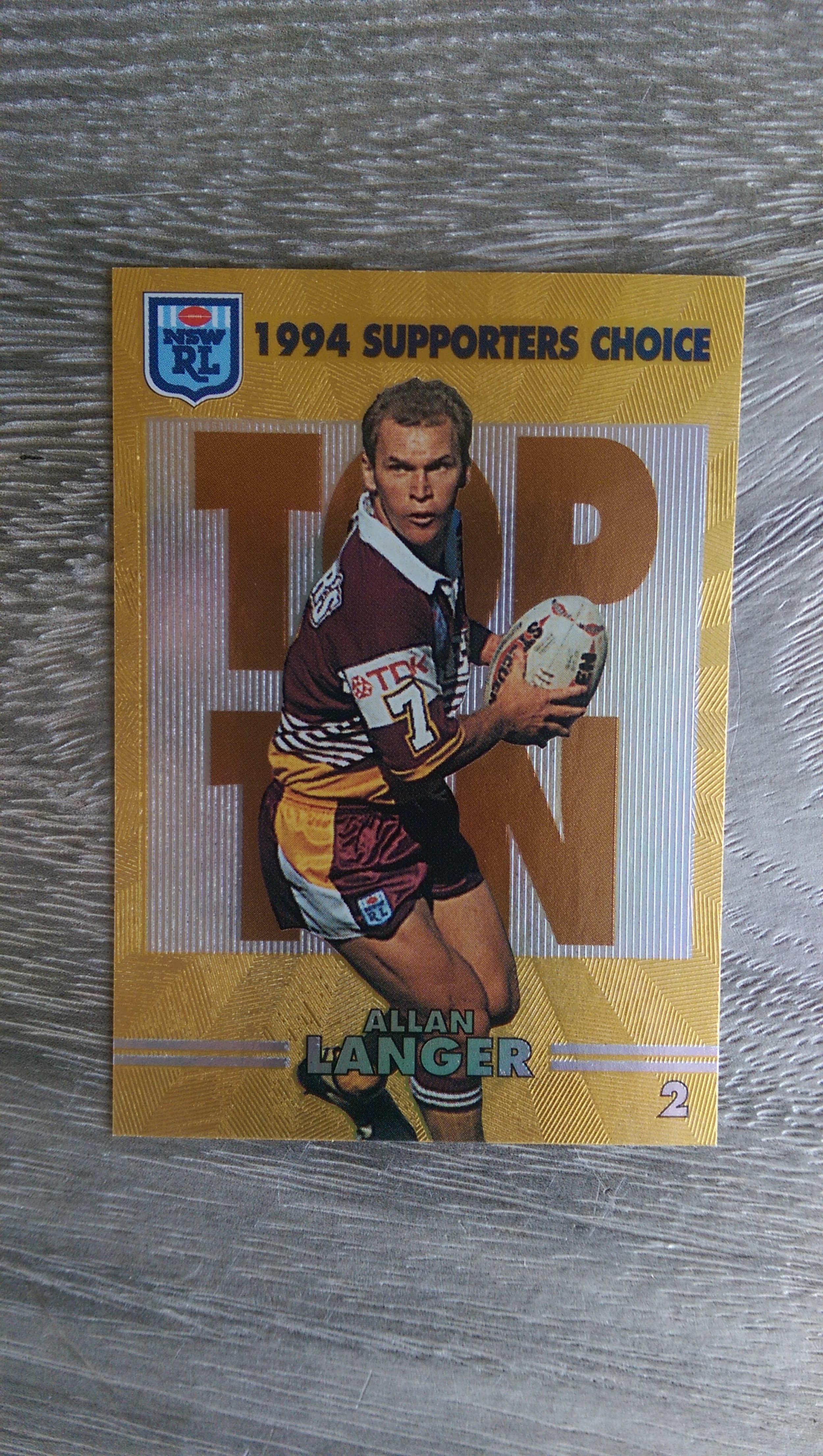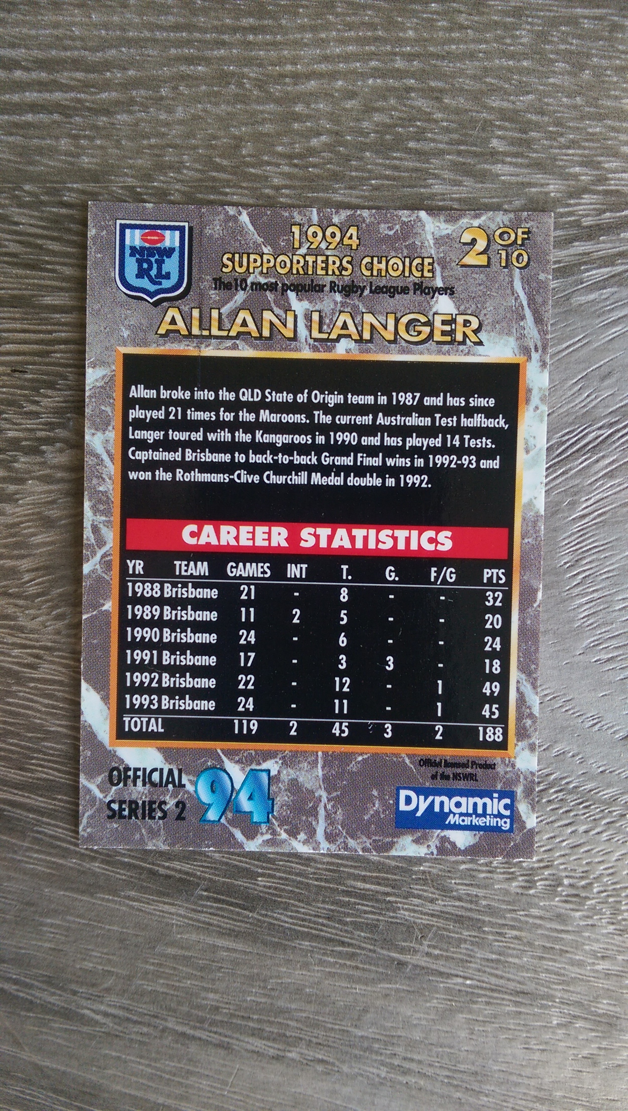 Here is a Allan Langer Supporters Choice card (No 2 of 10) issued by Dynamic 1994 and it is in excellent/near mint condition.