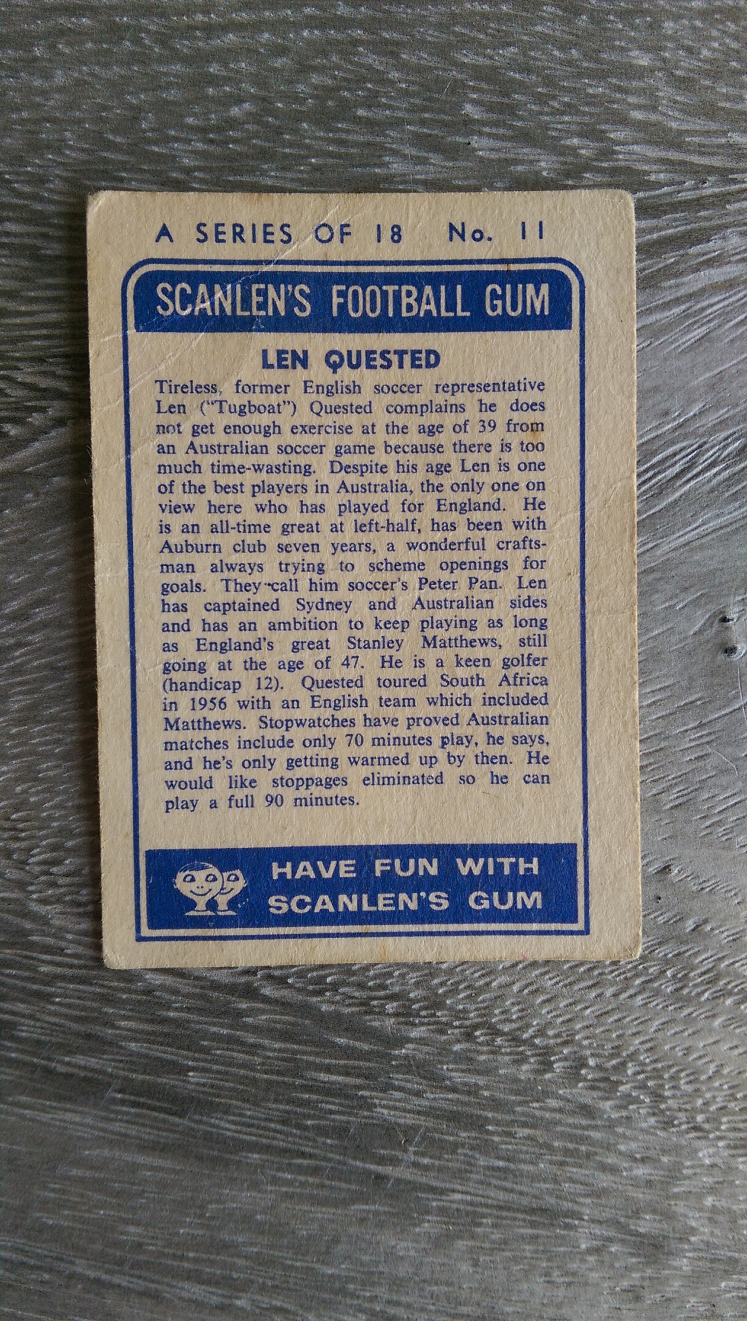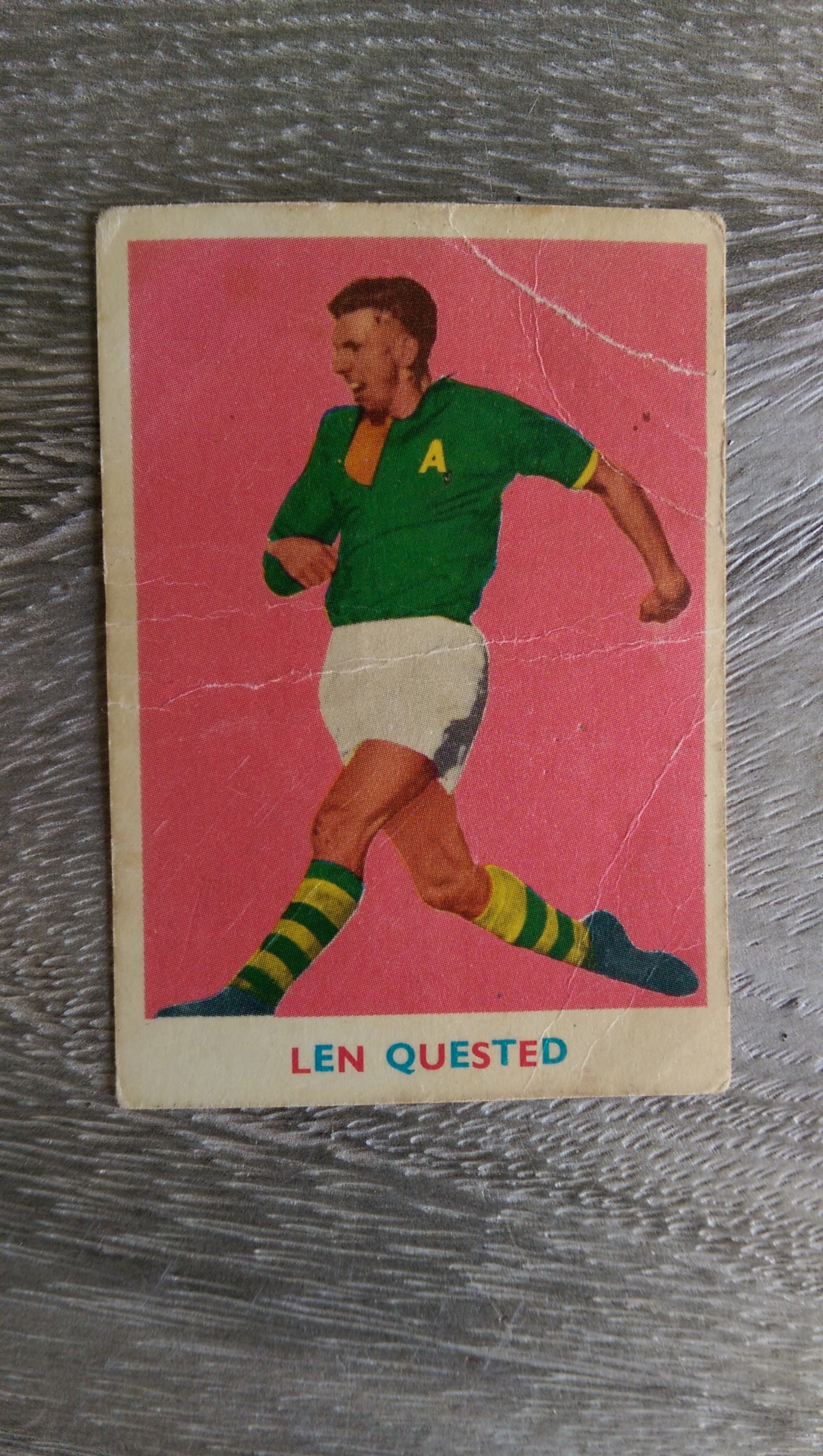 Here is a Len Quested card (No 11 of 18) from Scanlens soccer series issued in 1963 and it is in fair condition.