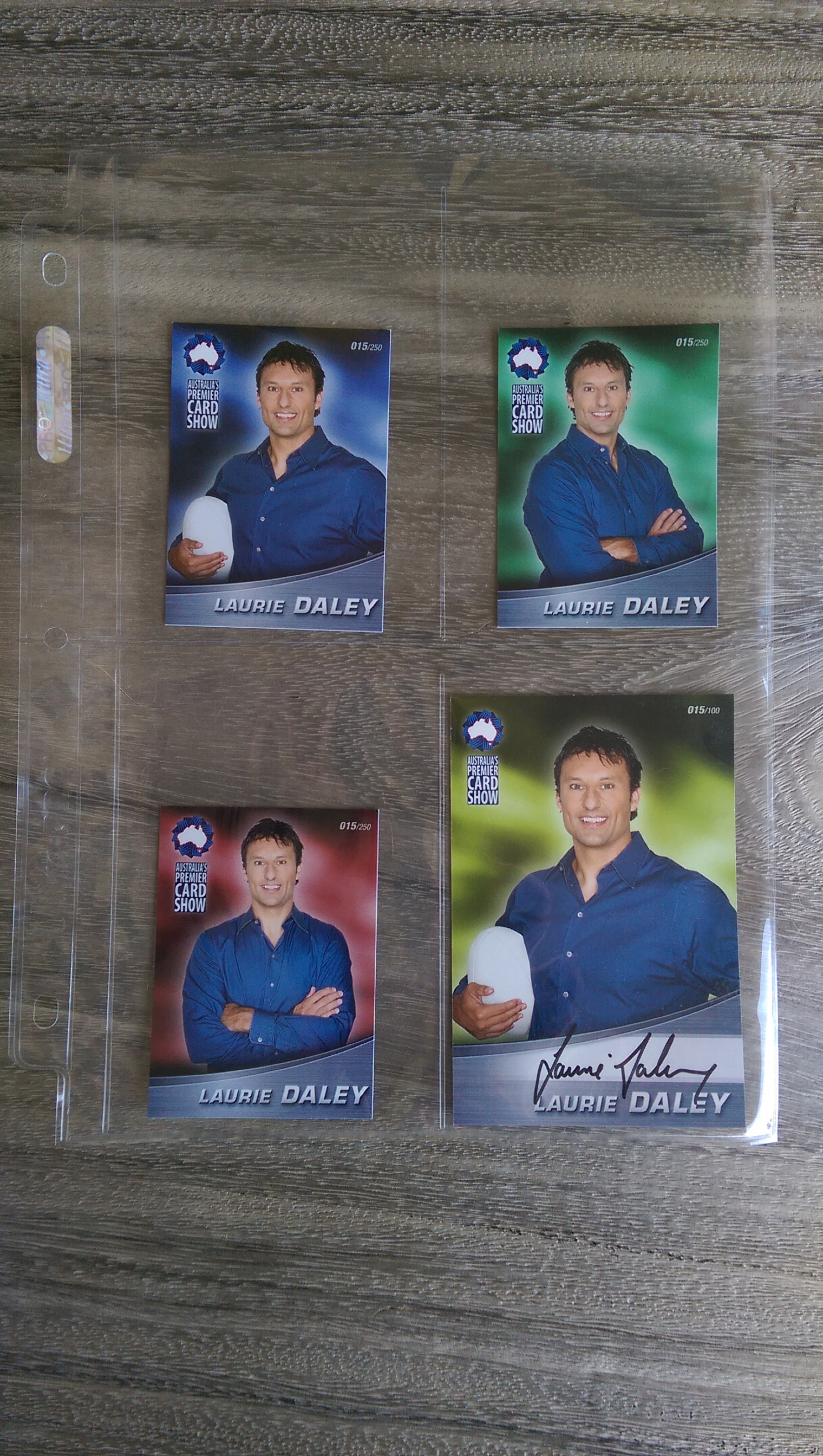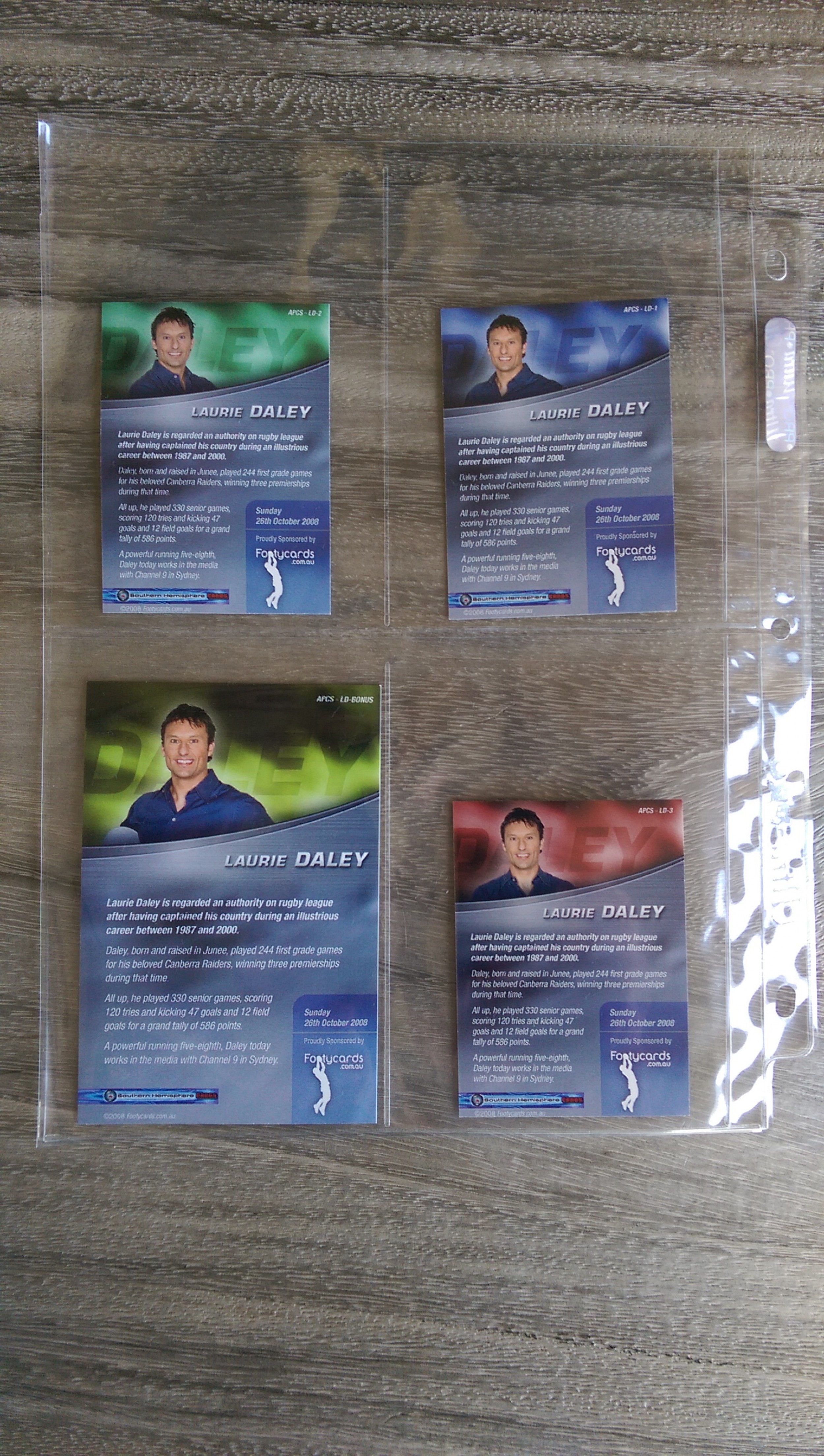 Here is a set of the 4 Laurie Daley cards issued at the inaugural APCS on 26 October 2008 at the Annandale Hotel. The cards are all number 15, of 100 for the large signed card and of 250 each for the 3 smaller cards.