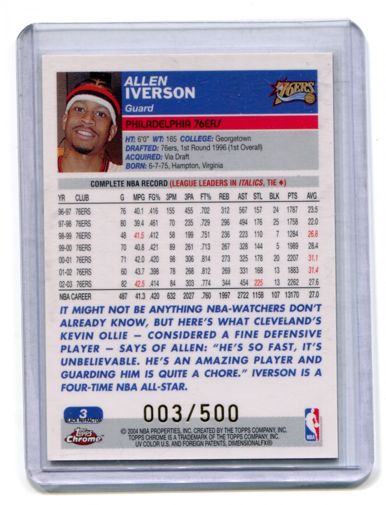 This listing is for 2003-04 Topps Chrome Refractors Black #3 Allen Iverson 003/500 - JERSEY NUMBERED - Philadelphia 76ers.