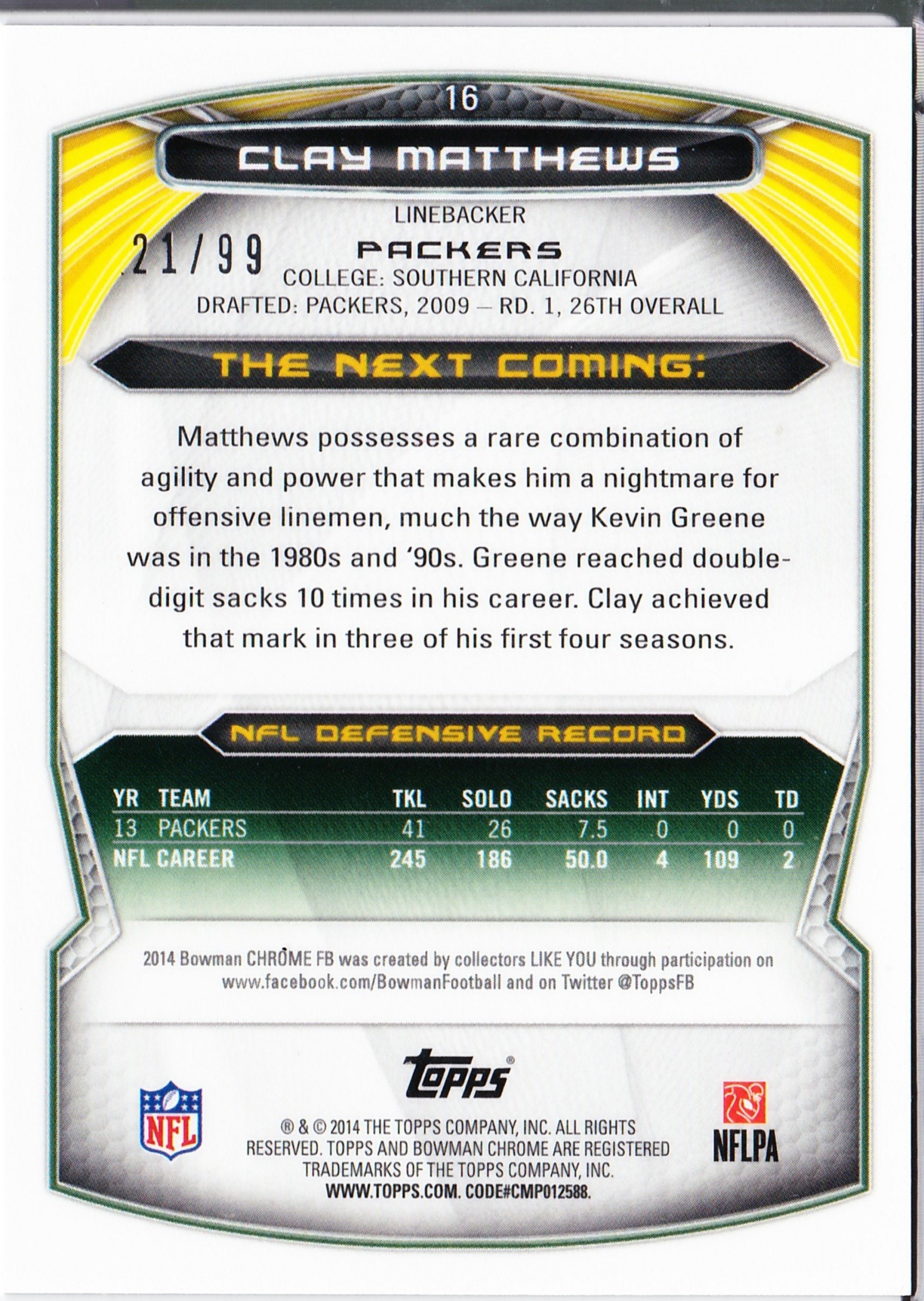 3 x Clay Matthews Numbered Inserts - Crown Royale, Inception, Bowman Chrome - Green Bay Packers / USC