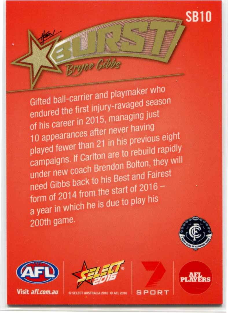 2016 Select AFL Footy Stars Starburst Caricatures SB10 Bryce Gibbs - Carlton. I do combine postage on multiple purchases, so checkout my other items. Please contact for postage costs on multiple purchases. If wanting registered post, it will be $3.80 extra. Payment by Paypal or Cash on Pick up.