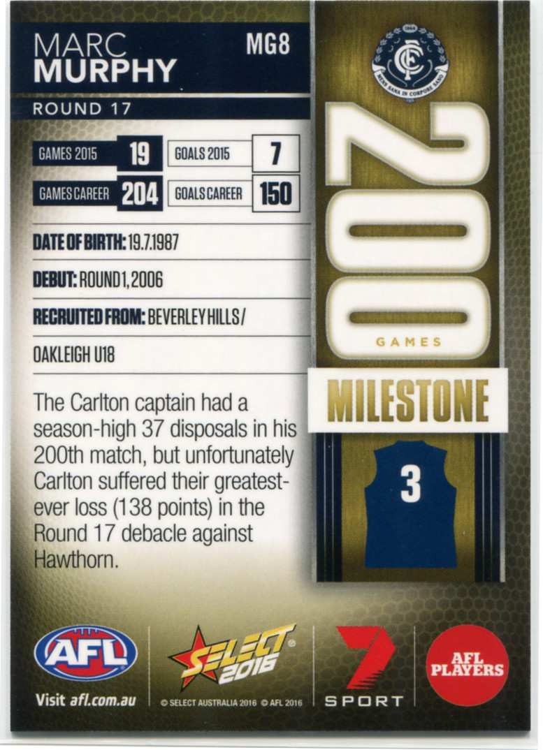 2016 Select AFL Footy Stars AFL Milestone Games MG8 Marc Murphy - Carlton