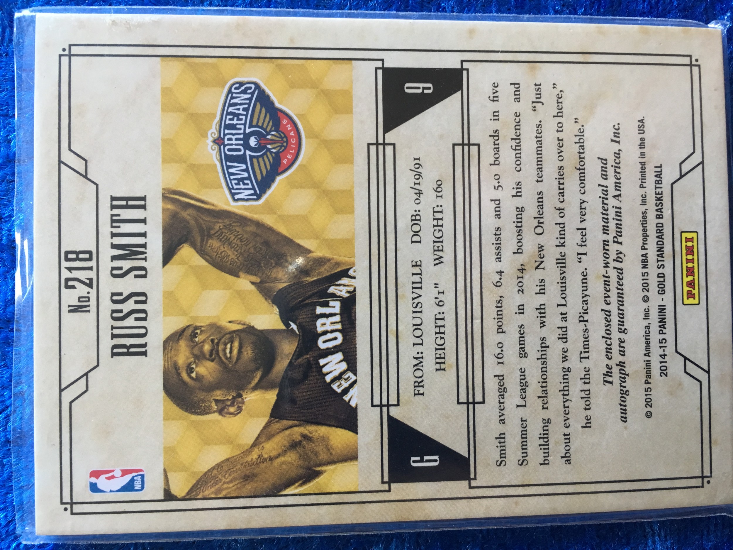 Russ Smith New Orleans Pelicans 2014-15 Panini Gold Standard Rookie Autograph Jersey Swatch #85/199