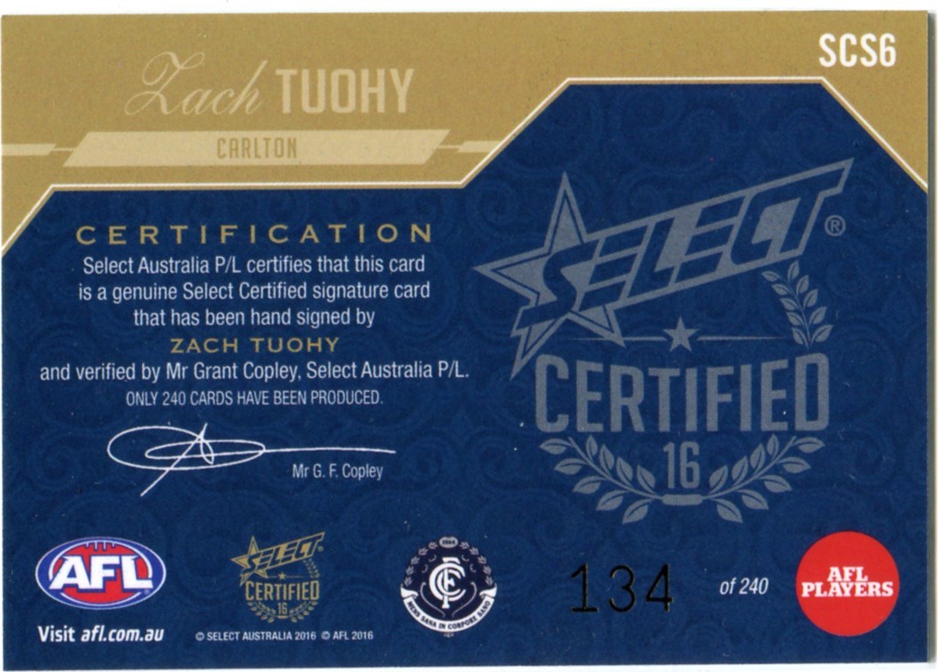 2016 Select Certified AFL Certified Signatures SCS6 Zach Tuohy 134/240 - Carlton Blues