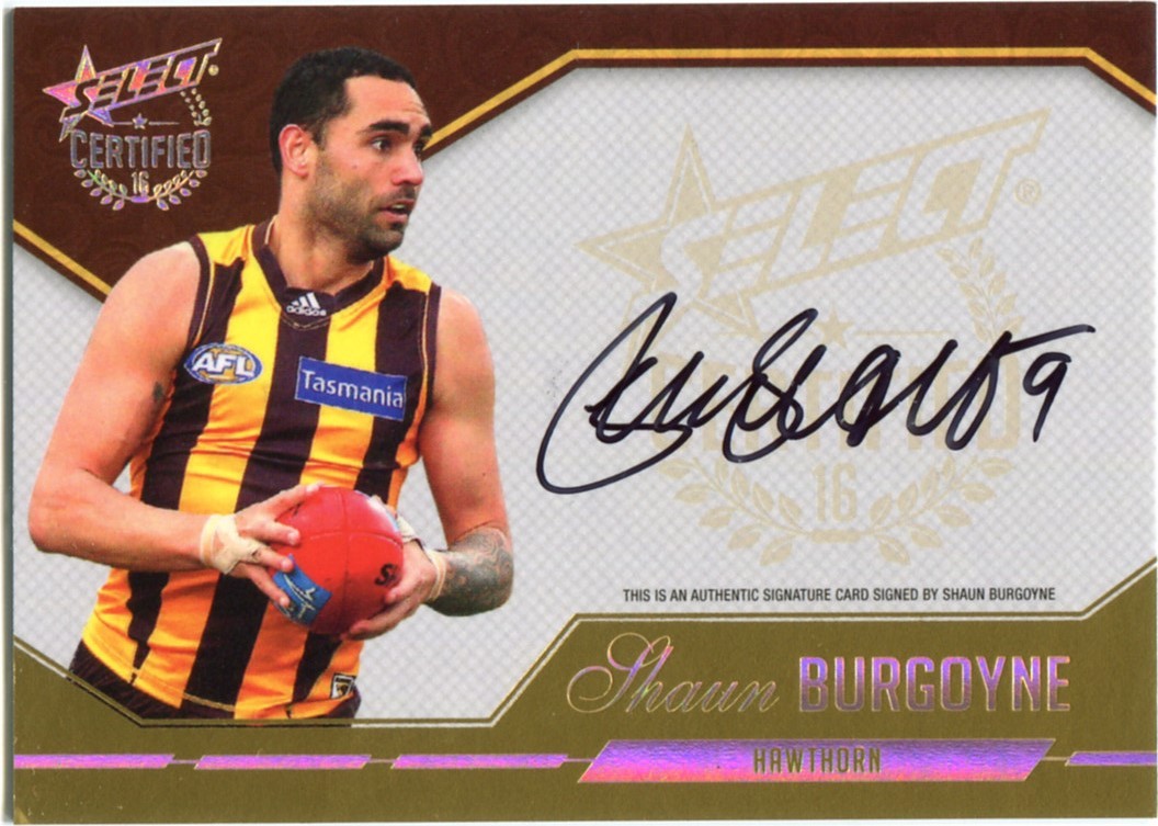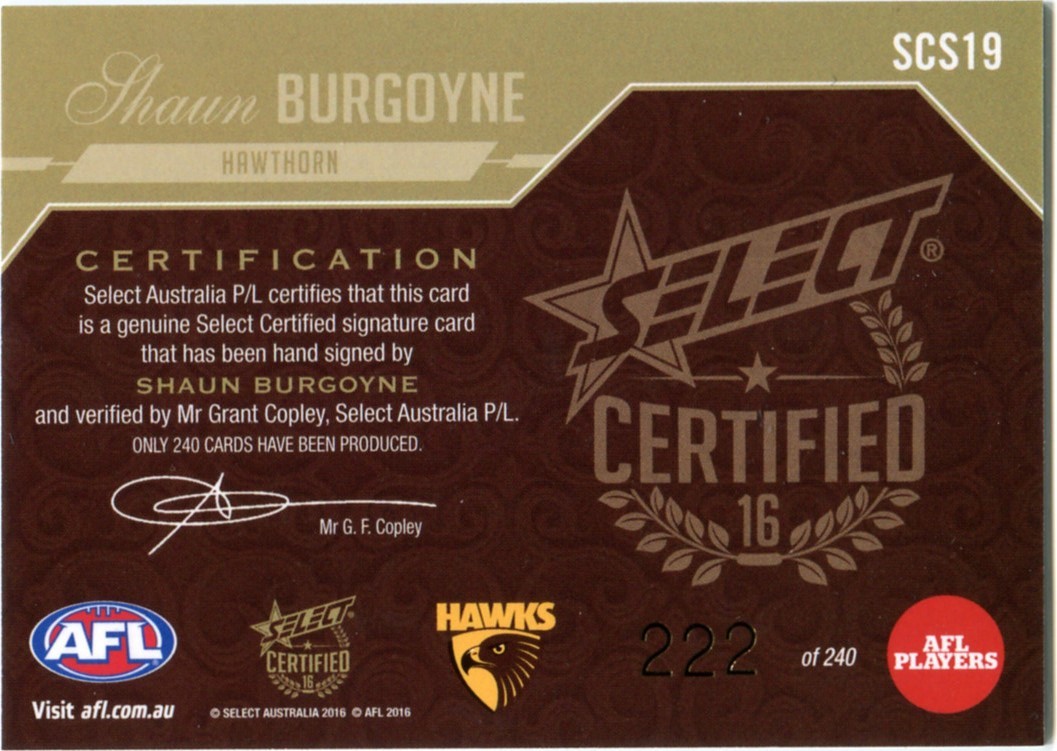 2016 Select Certified AFL Certified Signatures SCS19 Shaun Burgoyne 222/240 - Hawthorn Hawks