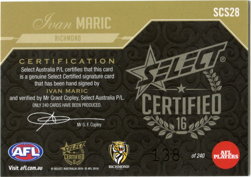 Item: 2016 Select Certified AFL Certified Signatures SCS28 Ivan Maric 138/240 - Richmond Tigers