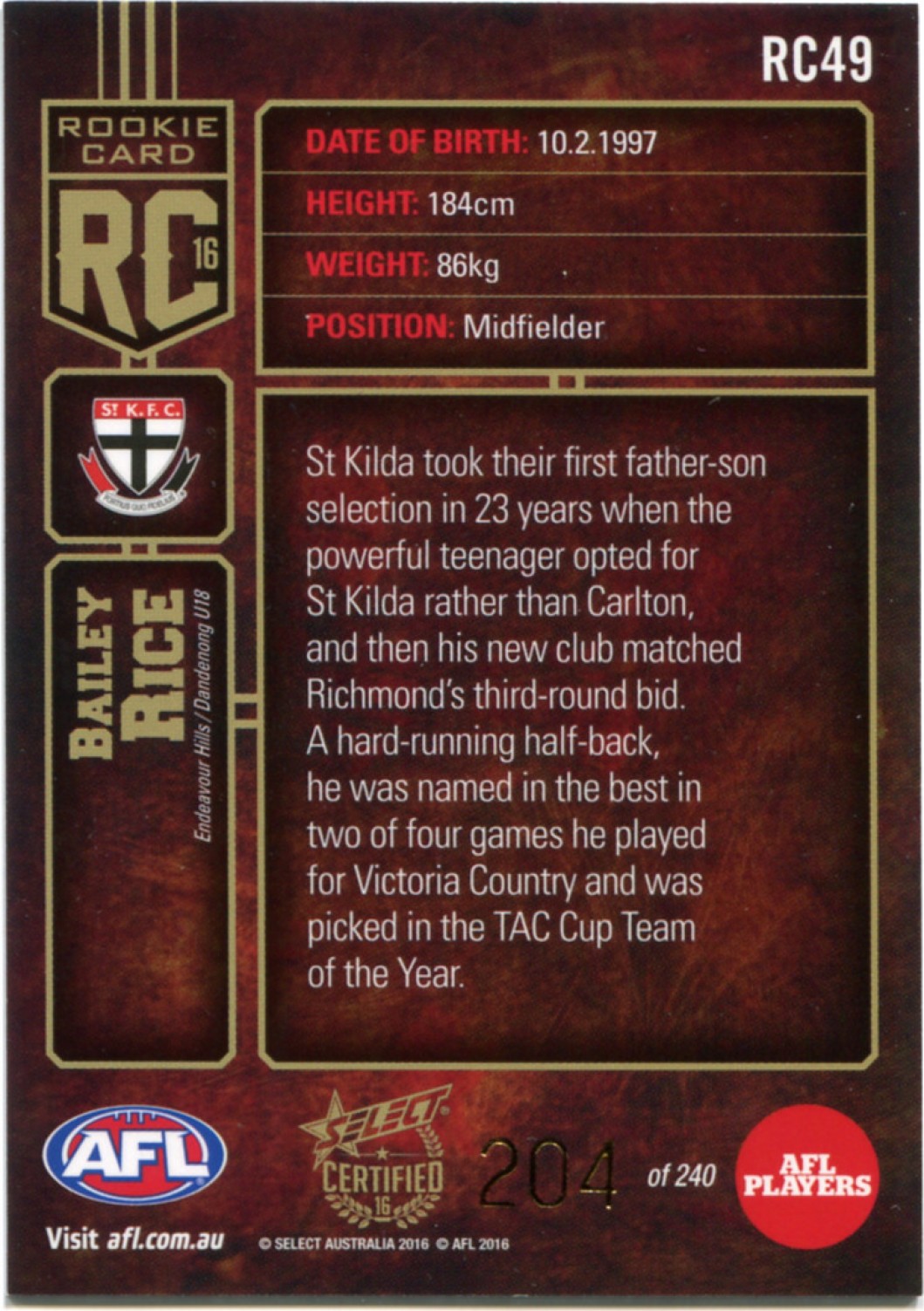 Item: 2016 Select Certified AFL Rookie Card RC49 Bailey Rice 204/240 - St Kilda Saints