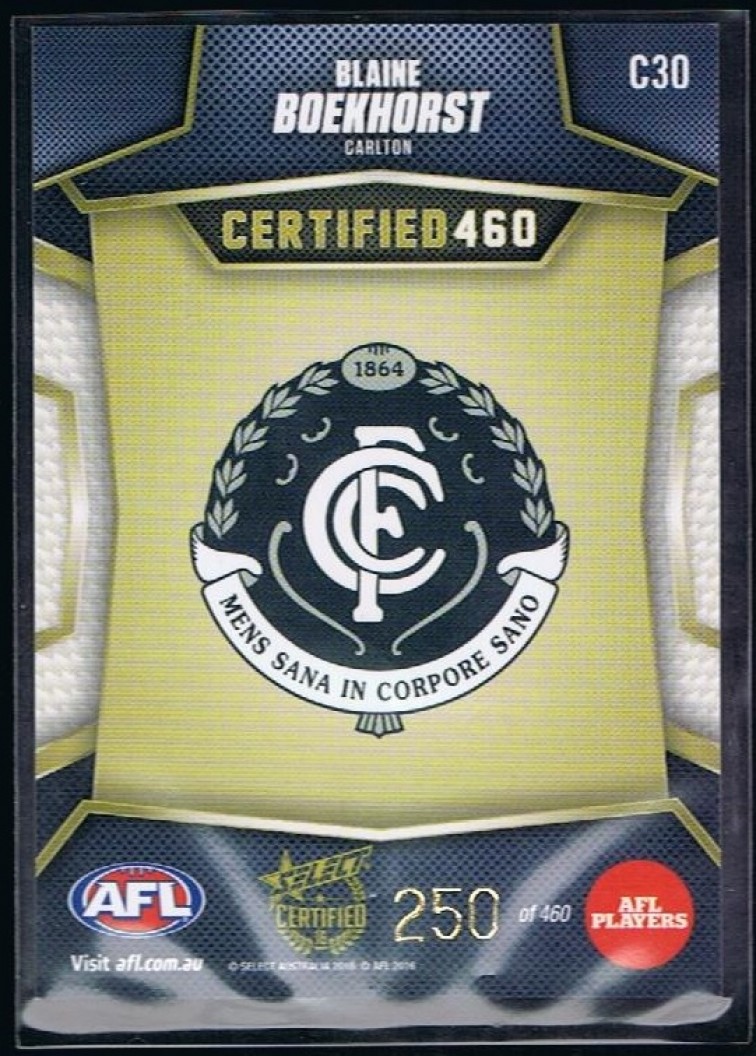 2016 SELECT AFL CERTIFIED C30 BLAINE BOEKHORST CERT460 - #250/460 CARLTON BLUES