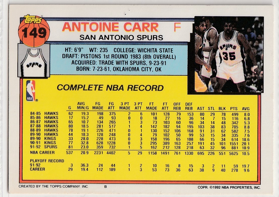 1992-93 TOPPS #149 ANTOINE CARR 🏀 NBA CARD 🏀 EX CONDITION 🏀