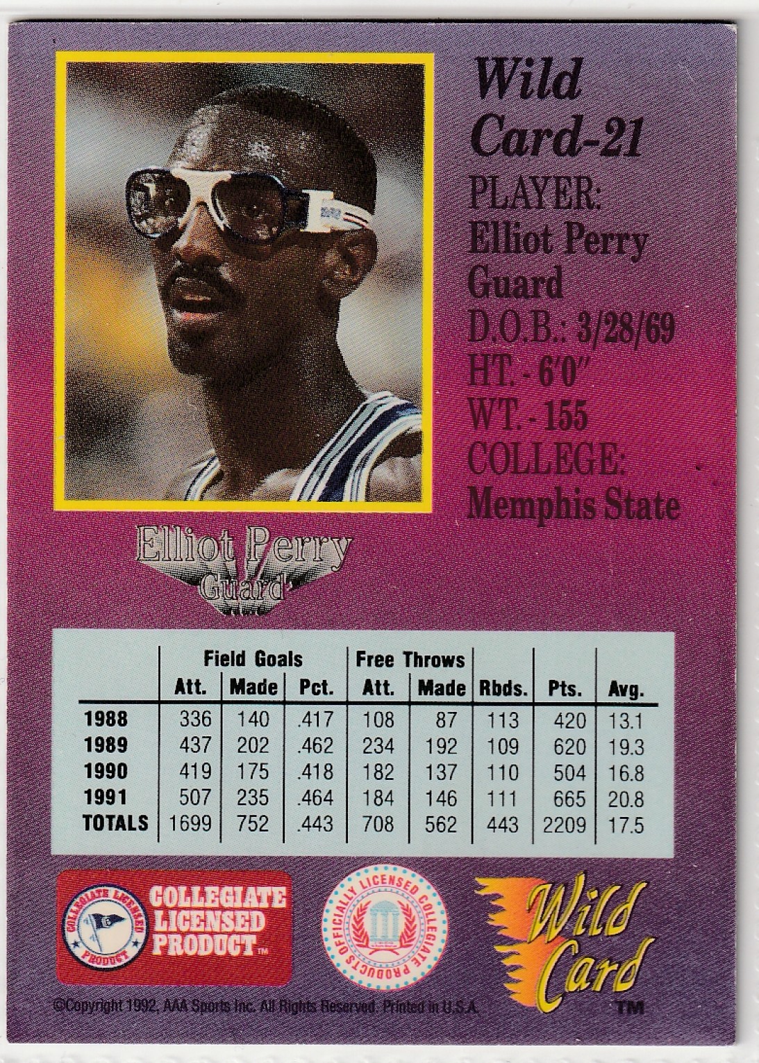 1992 WILD CARD - 21 ELLIOT PERRY 🏀 1st Edition COLLEGIATE BASKETBALL CARD 🏀 AAA Sports 🔔 EX Condition 💨