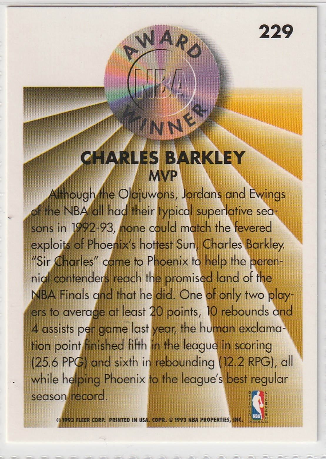 1993-94 FLEER #229 CHARLES BARKLEY MVP - AWARD WINNER 👀🏀 NBA BASKETBALL CARD 🏀 NM Condition 🏀 SERIES 1 💨