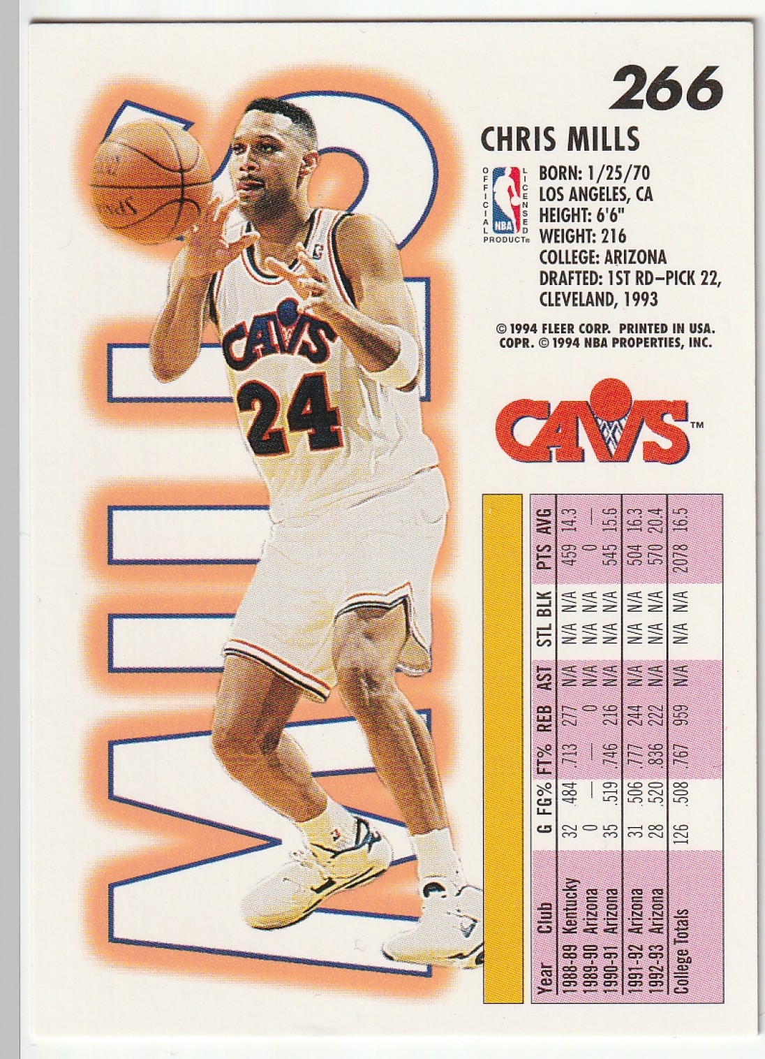 1993-94 FLEER NBA #266 CHRIS MILLS RC* π₯π₯π₯ SERIES 2 CARD πππ MINT Conditionπ―ππ― ROOKIE