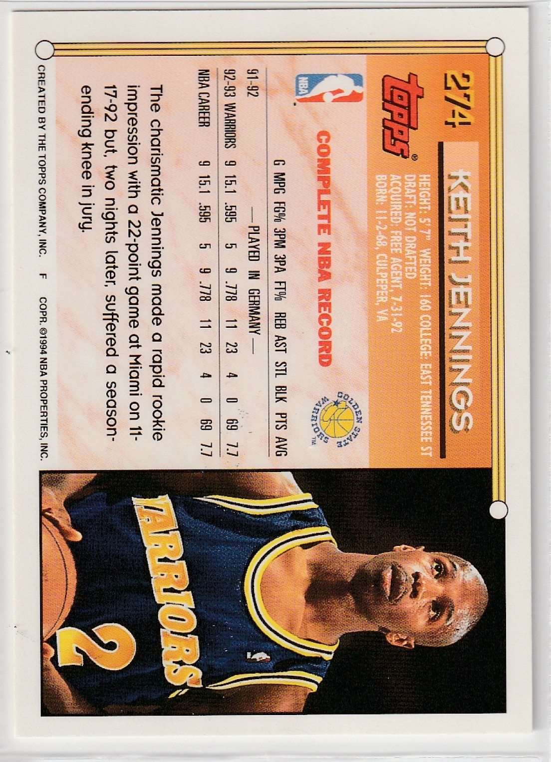 1993-94 TOPPS NBA #274 KEITH JENNINGS π₯π₯π₯ SERIES 2 CARDπππ MINT Condition π―ππ―
