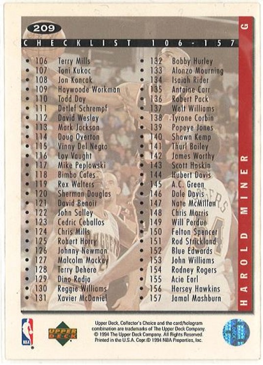 1993/94 UD COLLECTORS CHOICE HAROLD MINER CHECKLIST PARALLEL GOLD SIGNATURE NO 209