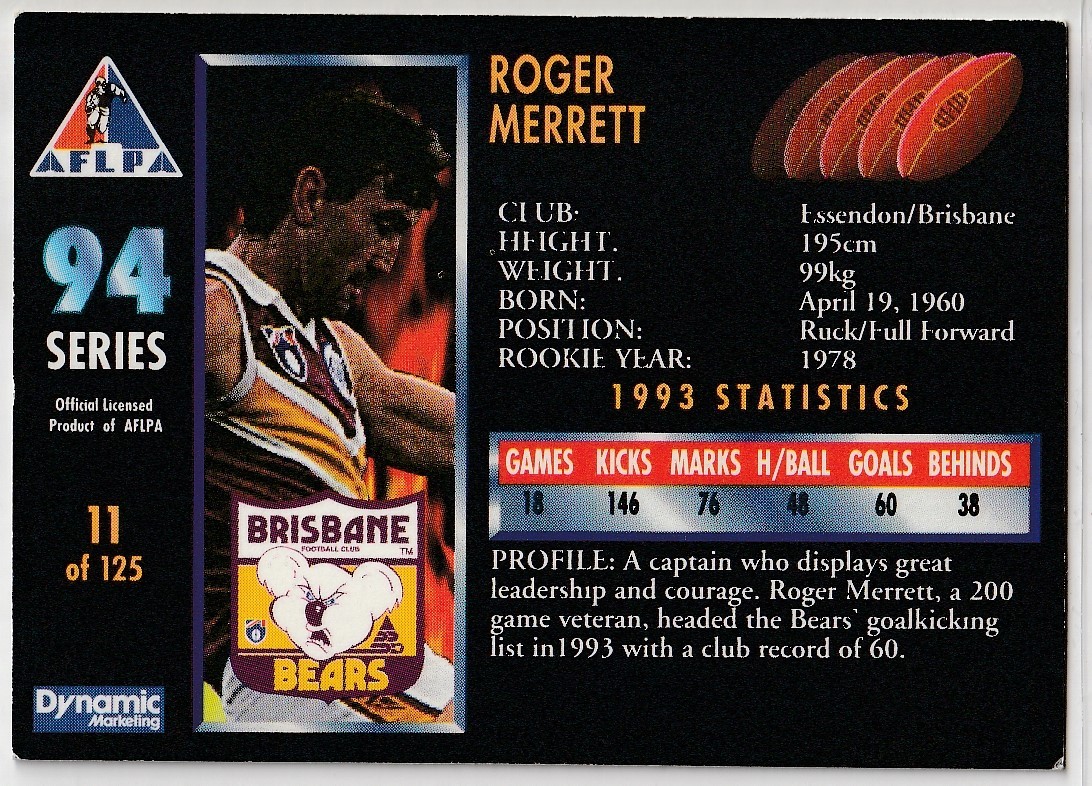 1994 DYNAMIC AFL - HOT PICKS TEAM MVP #11 ROGER MERRETT 🏉⚡🏉💨