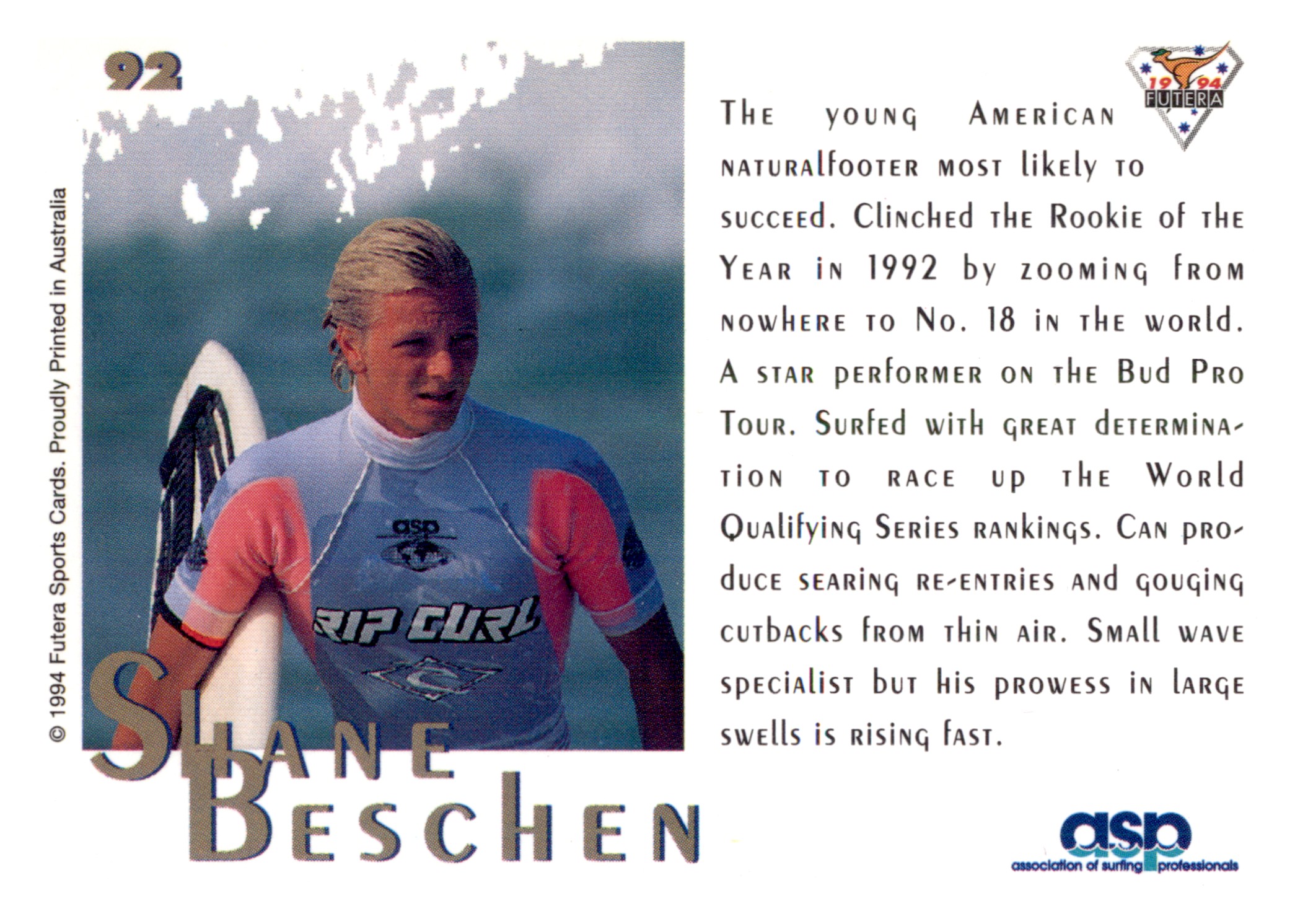 1994 FUTERA HOT SURF CARD ASP HONOURS AWARDS 92 SHANE BESCHEN