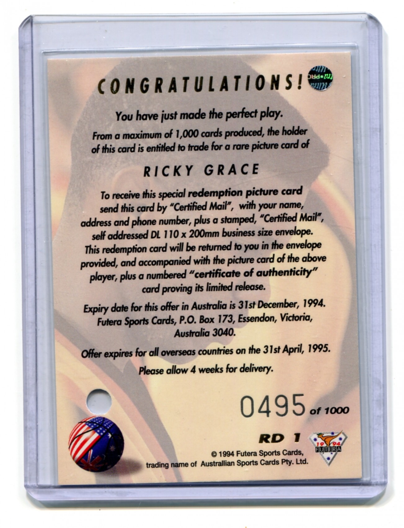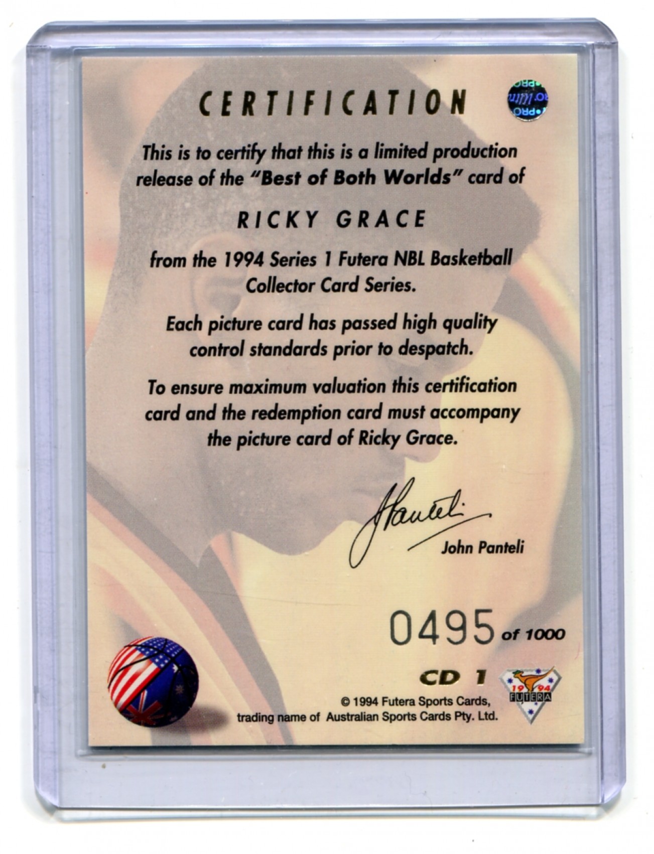 1994 Futera NBL Series 1 Best of Both Worlds BW1 Ricky Grace 0495/1000 (Redemption and Certificate cards included)