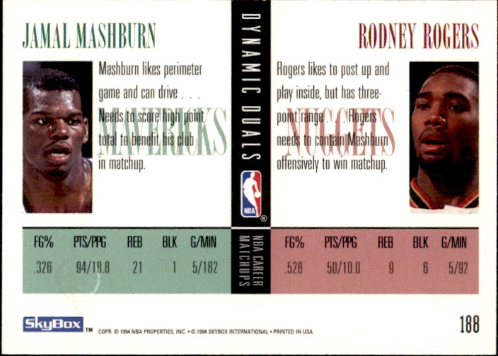 1994 NBA BASKETBALL SKYBOX CARD #188 DYNAMIC DUALS JAMAL MASHBURN / RODNEY ROGERS