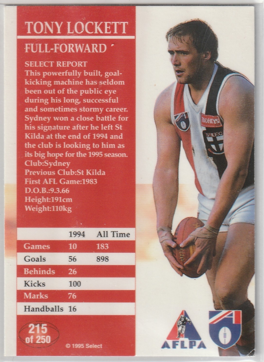 1995 SELECT AFL #215 TONY LOCKETT 🔥🏉 AFL 🏉🔥