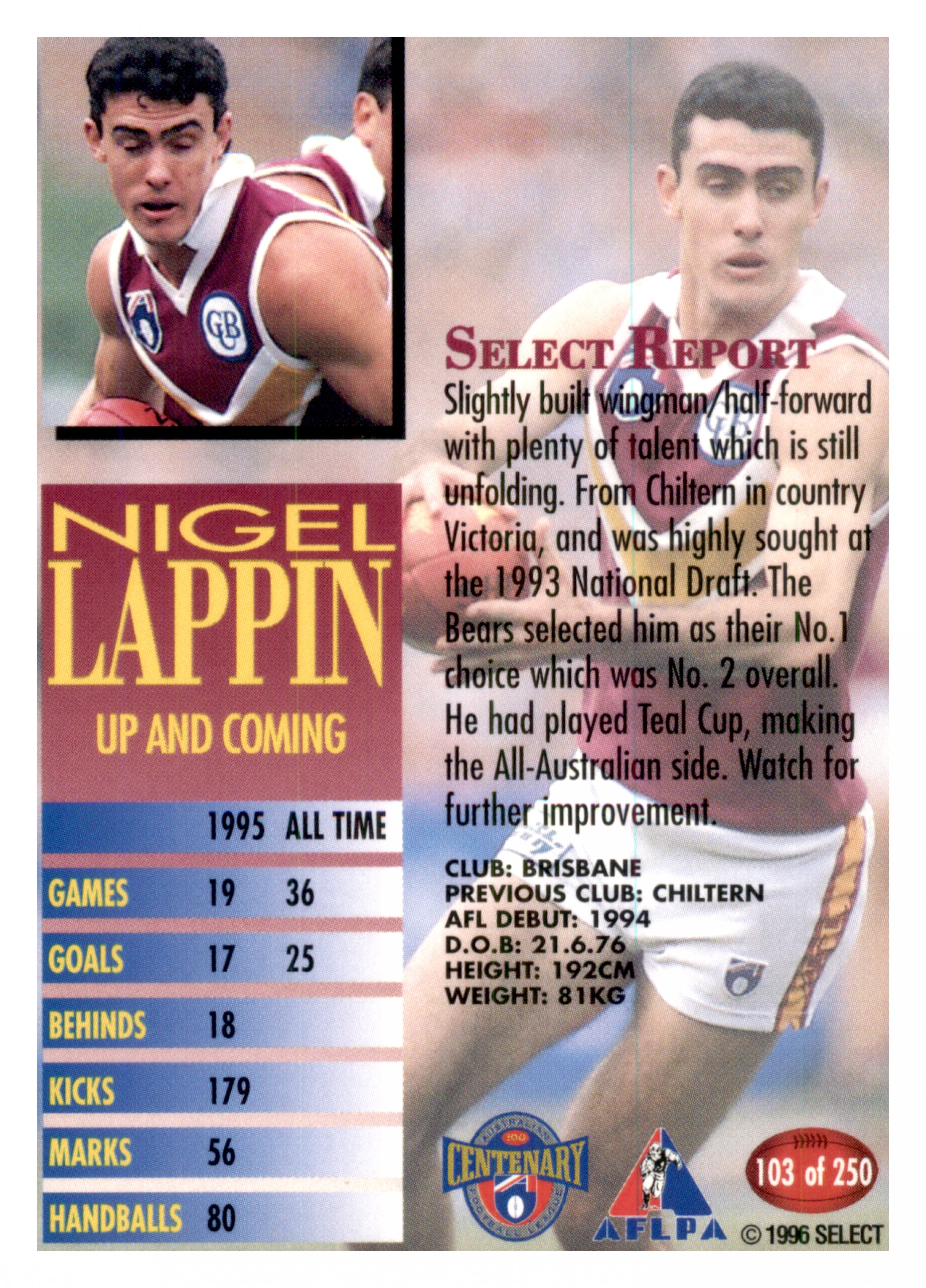1996 AFL SELECT SERIES 1 #103 NIGEL LAPPIN - BRISBANE BEARS