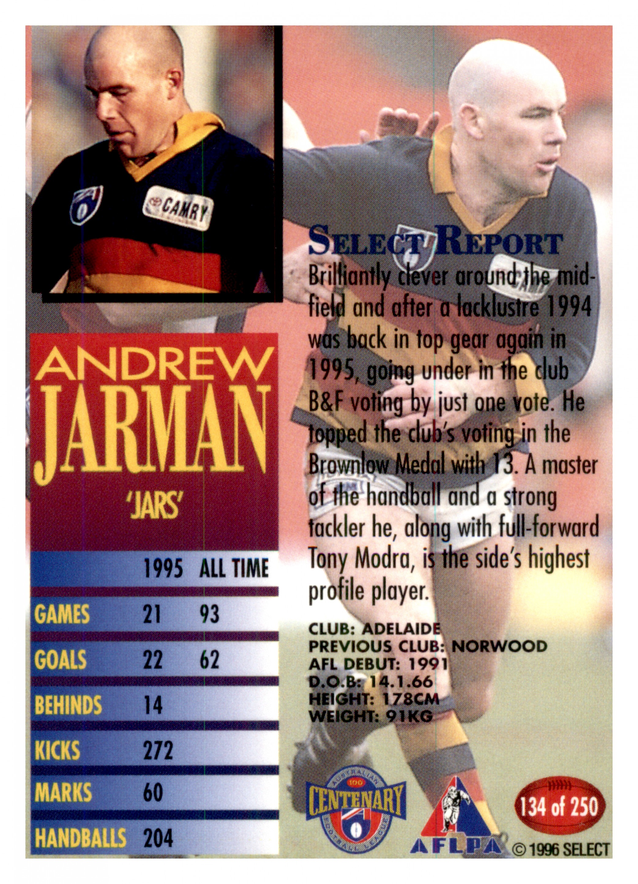 1996 AFL SELECT SERIES 1 #134 ANDREW JARMAN - ADELAIDE CROWS