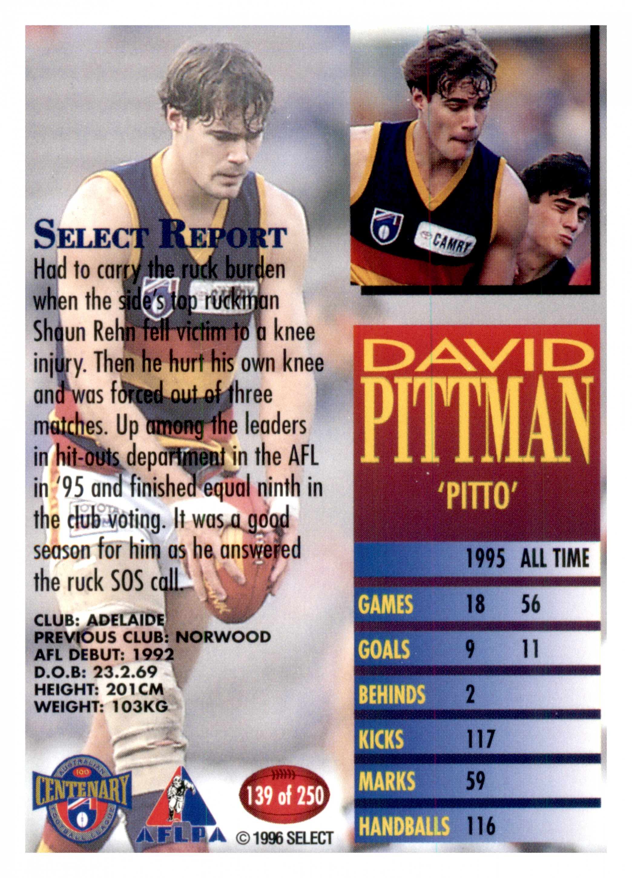 1996 AFL SELECT SERIES 1 #139 DAVID PITTMAN - ADELAIDE CROWS