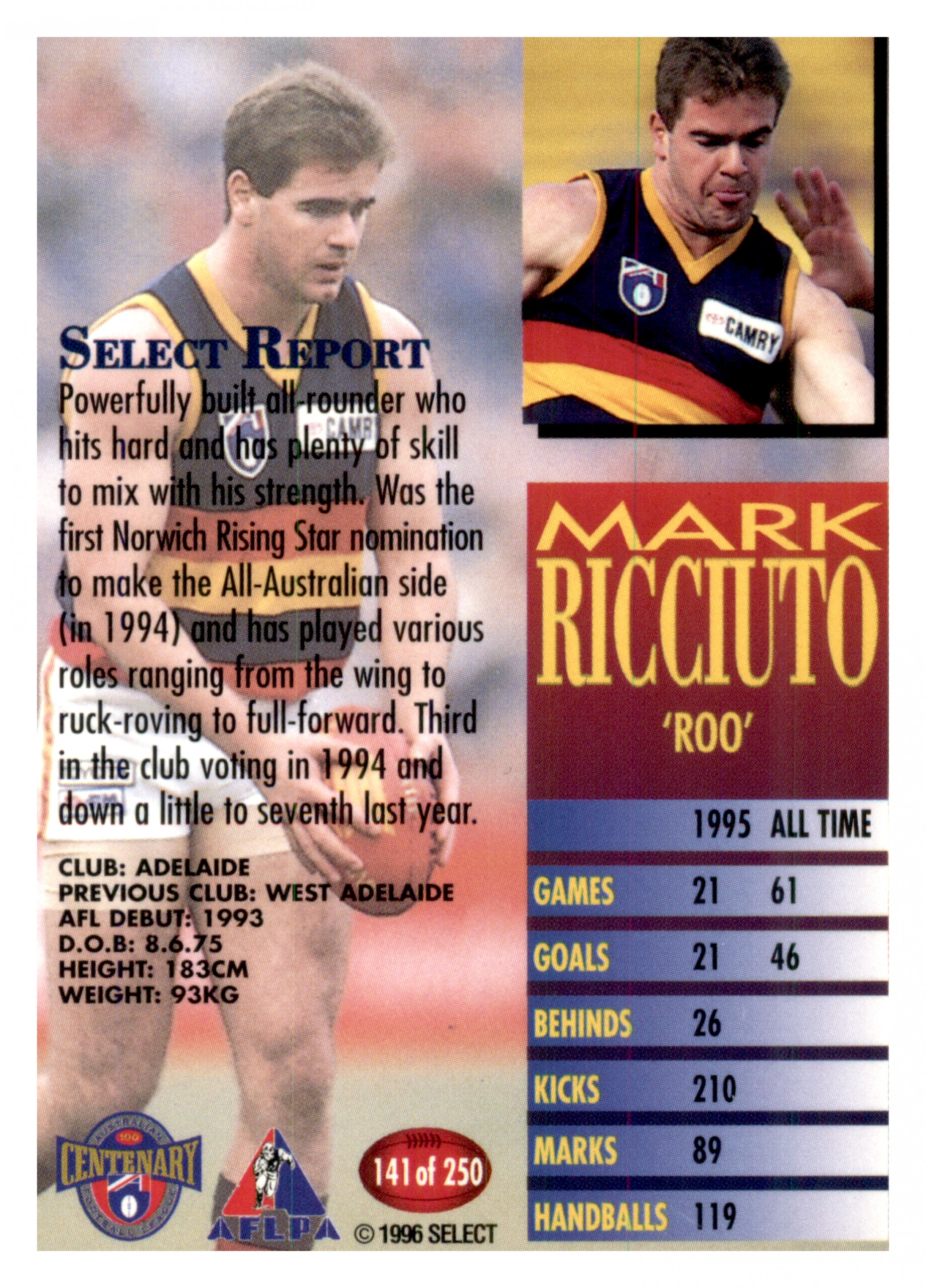 1996 AFL SELECT SERIES 1 #141 MARK RICCIUTO - ADELAIDE CROWS