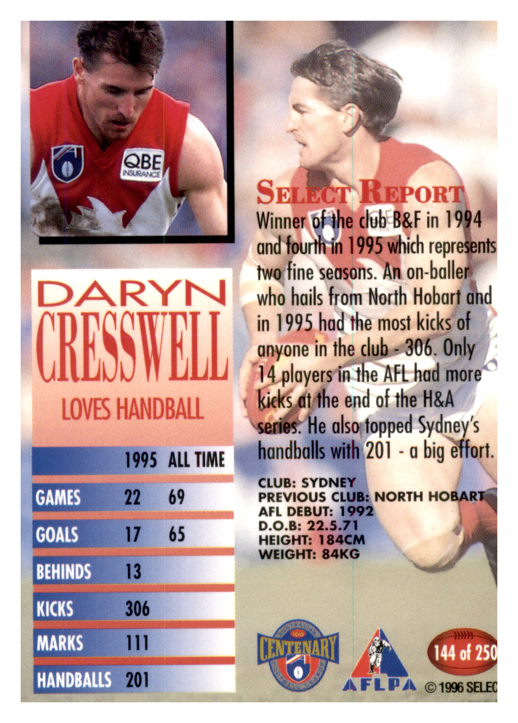 1996 AFL SELECT SERIES 1 #144 DARYN CRESSWELL - SYDNEY SWANS