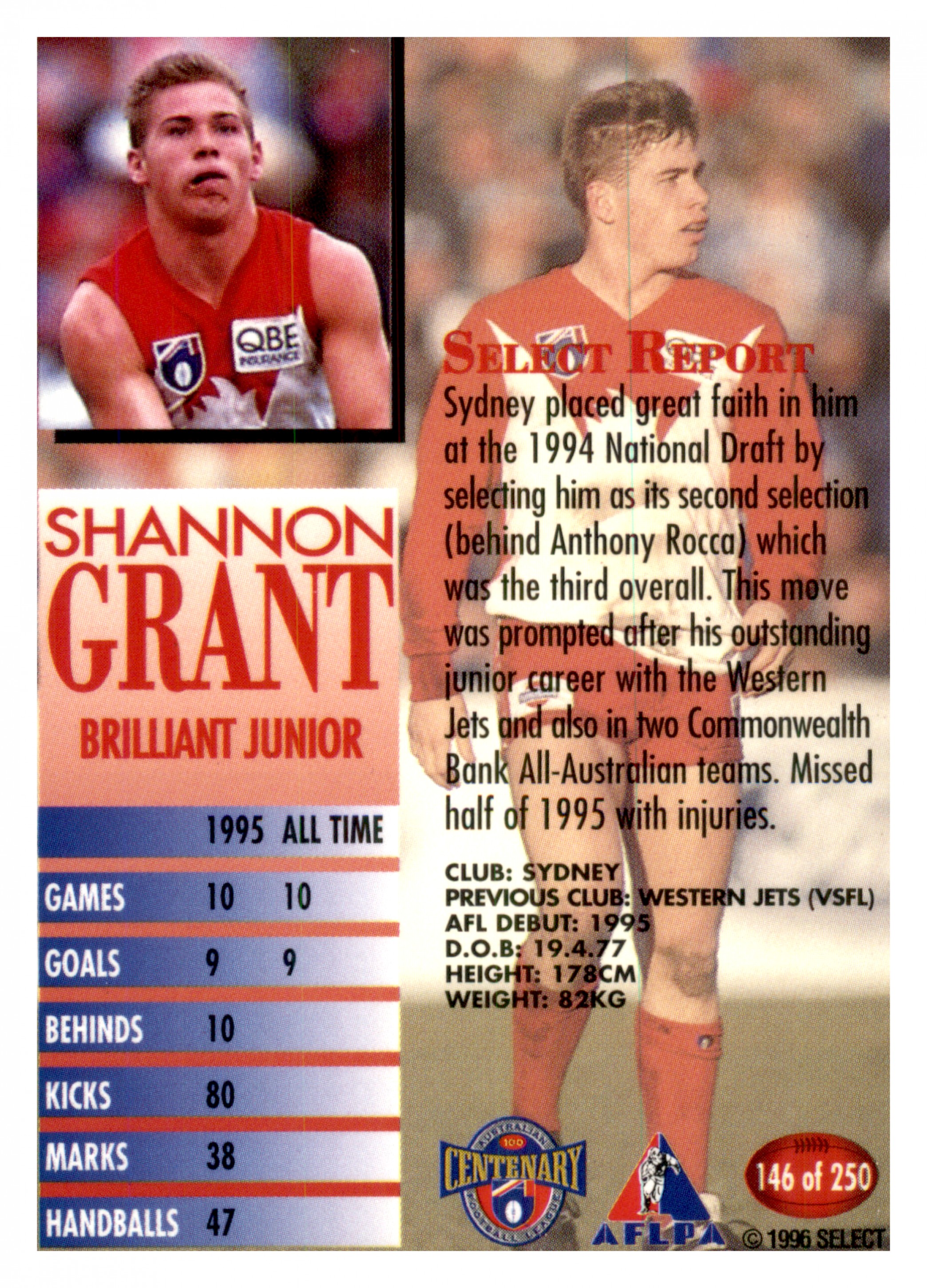 1996 AFL SELECT SERIES 1 #146 SHANNON GRANT - SYDNEY SWANS
