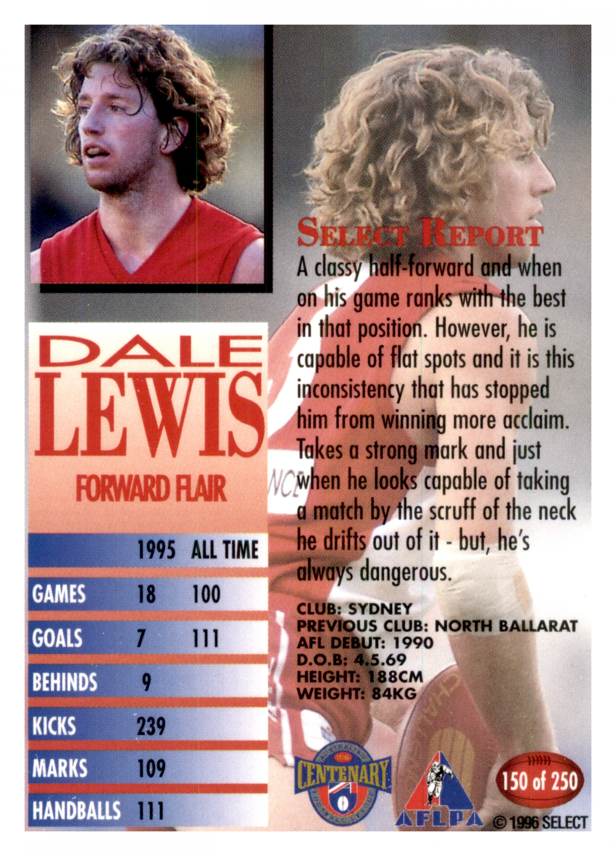 1996 AFL SELECT SERIES 1 #150 DALE LEWIS - SYDNEY SWANS