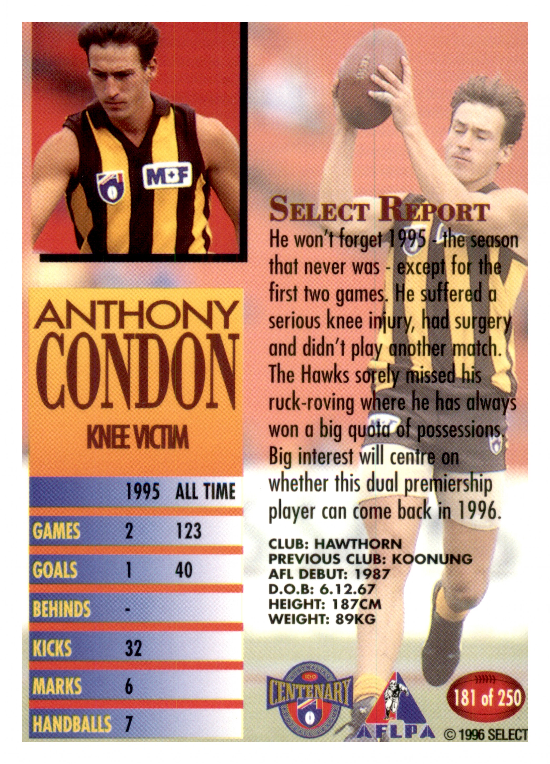 1996 AFL SELECT SERIES 1 #181 ANTHONY CONDON - HAWTHORN HAWKS
