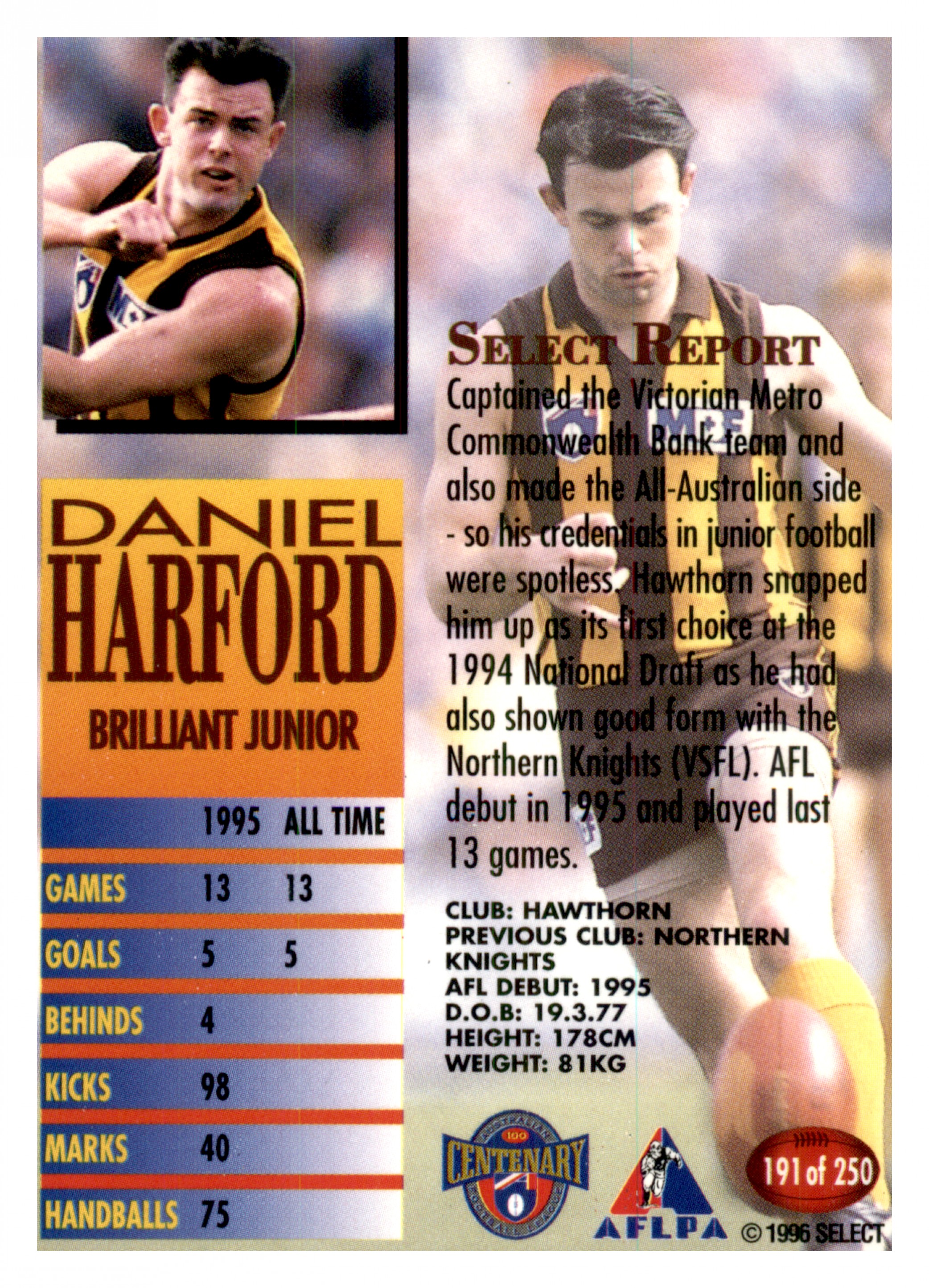 1996 AFL SELECT SERIES 1 #191 DANIEL HARFORD - HAWTHORN HAWKS